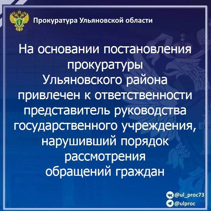 По результатам рассмотрения возбужденного прокурором Ульяновского района Ульяновской области дела об административном правонарушении по ст. 5.59 КоАП РФ (нарушение порядка рассмотрения обращений граждан) начальник отдела реализации программ социального благополучия областного государственного казенного учреждения социальной защиты населения Ульяновской области по Ульяновскому району подвергнута штрафу в размере 5 тысяч рублей.