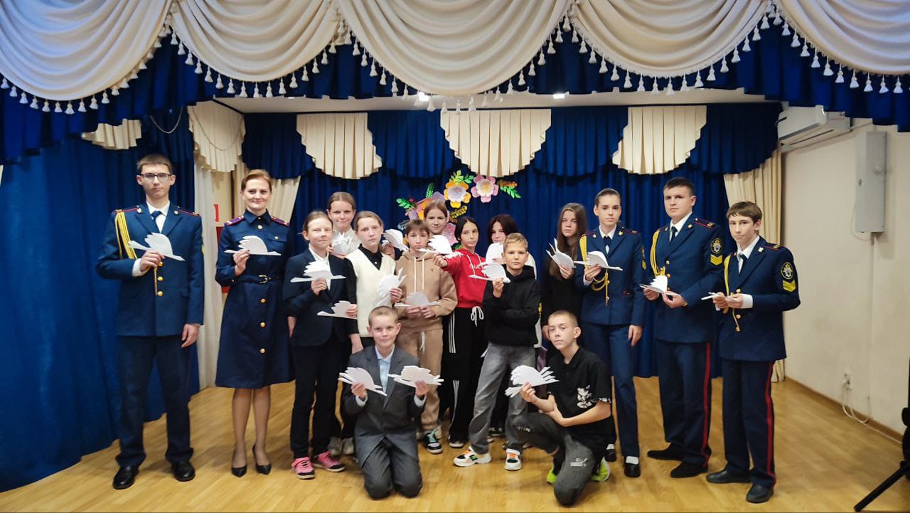 В этот раз кадеты рассказали о Всероссийской акции памяти павших воинов «Дни белых журавлей», посвященной всем защитникам Отечества, не вернувшимся с полей сражений, и о символике акции – белых журавлях.