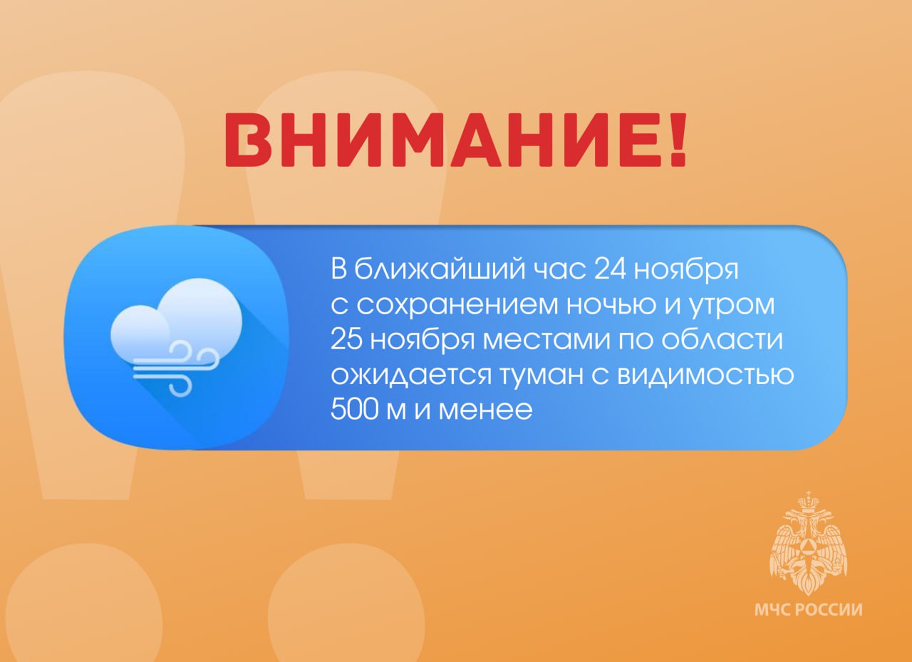 В ближайший час 24 ноября с сохранением ночью и утром 25 ноября местами по области ожидается туман с видимостью 500 м и менее.