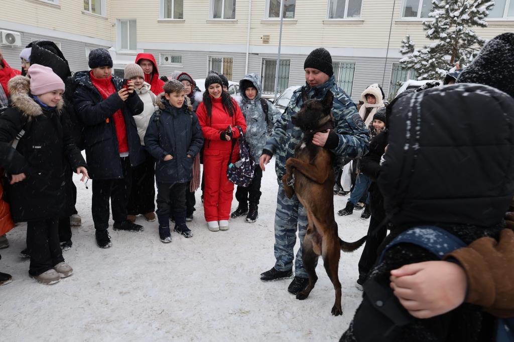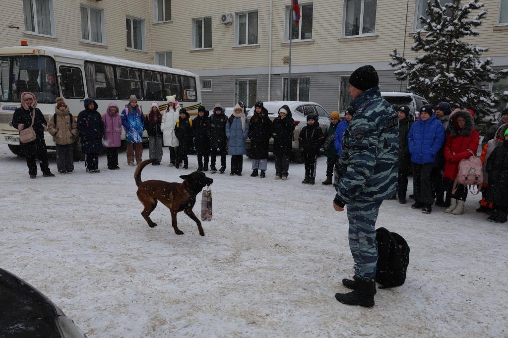 Инструктор-кинолог познакомил юных спортсменов с особенностями деятельности своего подразделения и продемонстрировал возможности применения служебной собаки по поиску взрывчатых и наркотических веществ, а также по выполнению различных команд.