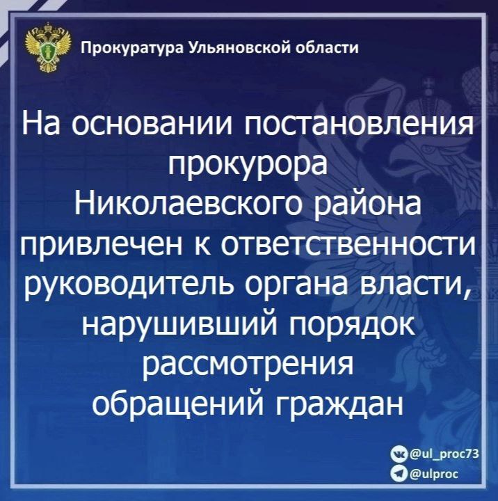 По результатам рассмотрения возбужденного прокурором Николаевского района Ульяновской области дела об административном правонарушении по ст. 5.59 КоАП РФ (нарушение порядка рассмотрения обращений граждан) и.о. главы администрации муниципального образования «Славкинское сельское поселение» подвергнута штрафу в размере 5 тысяч рублей.