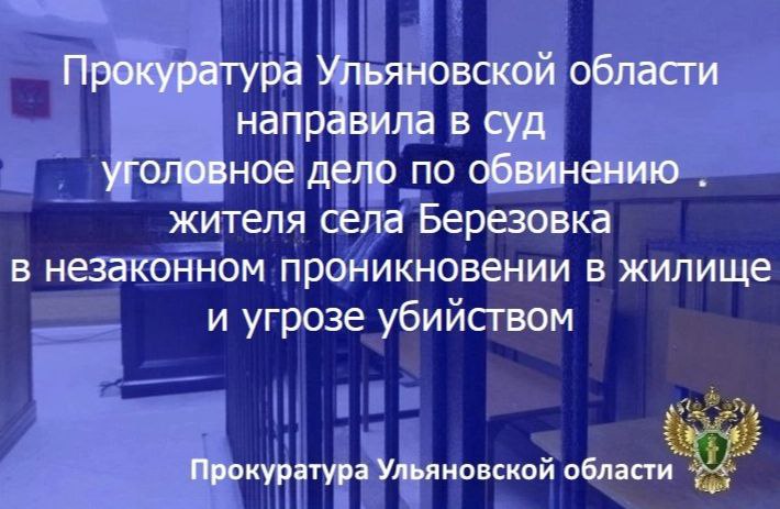 Заместитель прокурора Ульяновской области утвердил обвинительное заключение и направил в суд уголовное дело в отношении жителя региона. Он обвиняется в совершении преступлений по ч. 1 ст. 139 УК РФ (незаконное проникновение в жилище, совершенное против воли проживающего в нем лица), ч. 1 ст. 119 УК РФ (угроза убийством, если имелись основания опасаться осуществления этой угрозы).