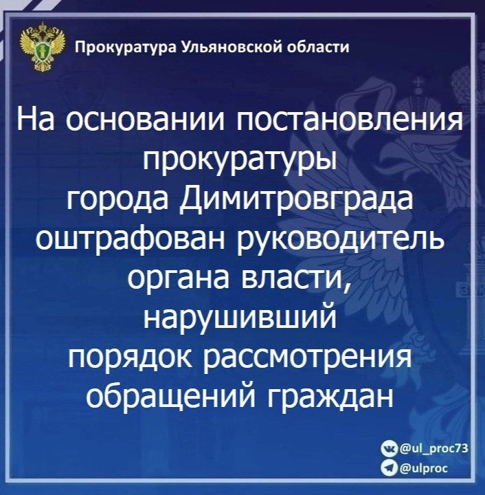 По результатам рассмотрения возбужденного прокурором г. Димитровграда Ульяновской области дела об административном правонарушении по ст. 5.59 КоАП РФ (нарушение порядка рассмотрения обращений граждан) председатель Комитета по жилищно-коммунальному комплексу Администрации города Димитровграда подвергнут штрафу в размере 5 тысяч рублей.
