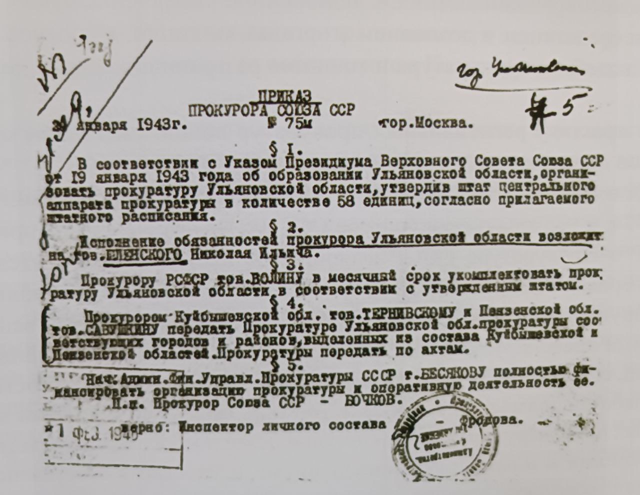 Приказом прокурора СССР от 20.01.1943 в связи с образованием Ульяновской области была создана региональная прокуратура. Первым прокурором Ульяновской области являлся Николай Ильич Шленский.