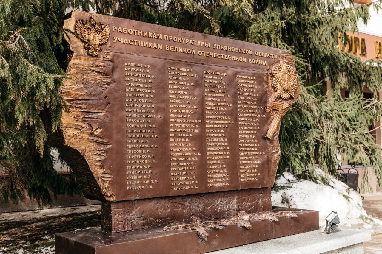 Имена ветеранов региональных органов прокуратуры навсегда сохранены в сердцах и высечены на установленном у здания прокуратуры Ульяновской области 7 мая 2015 года памятнике «Работникам прокуратуры Ульяновской области – участникам Великой Отечественной войны»: полный кавалер ордена Славы, участник Парада Победы на Красной площади Трофимов С.П., кавалеры ордена Красной Звезды Жданов Ф.В., Прохоров И.Н., Шамшин И.П., Пчеляков Н.И., Кожевников С.А., Силантьев А.Г., Трушенков Г.И., награжденные орденом Отечественной войны Разник А.М., Червякова А.И., Власов П.С., Воеводин М.И., Достовалов А.Г., Дьяконов А.Н., Кропачев И.П., Кузовкин В.В., Маврин Я.С., Панов М.Н., Пухов Н.С., Сухоручкин А.А. и другие.