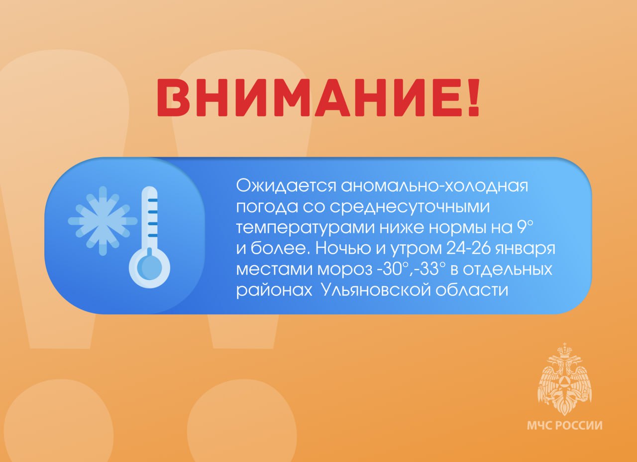 Ожидается аномально-холодная погода со среднесуточными температурами ниже нормы на 9° и более. Ночью и утром 24-26 января местами мороз -30°,-33° в отдельных районах Ульяновской области.