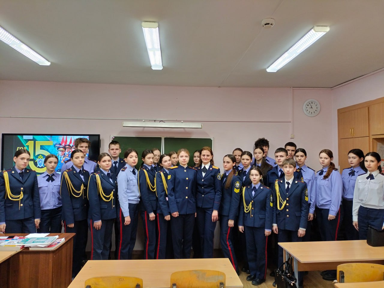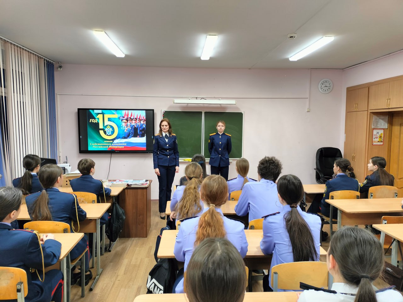 В ознаменование 15-летия образования СК России помощник руководителя следственного управления Майя Шарова и курсант Санкт-Петербургской академии СК России Вероника Толкачева встретились с кадетами средней школы N 15 г. Ульяновска.