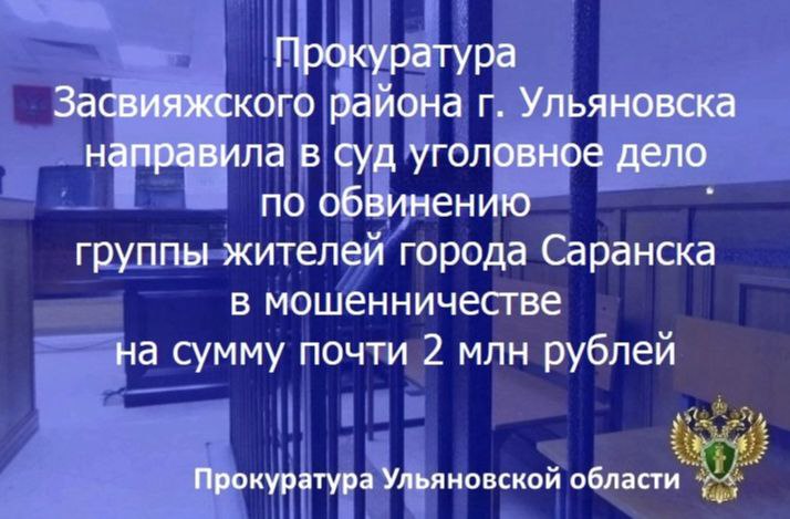 Прокурор Засвияжского района г. Ульяновска утвердил обвинительное заключение и направил в суд уголовное дело в отношении 4 жителей Республики Мордовия. Они обвиняются в совершении преступления по ч. 4 ст. 159 УК РФ (мошенничество, совершенное организованной группой, в особо крупном размере).