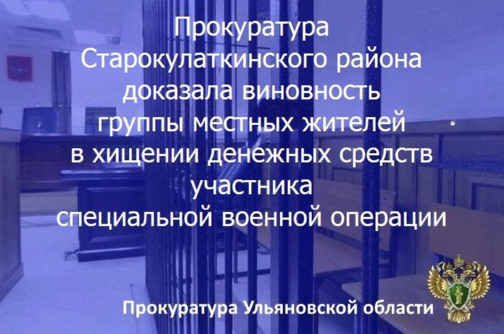 Прокурор Старокулаткинского района Ульяновской области поддержал государственное обвинение в судебном процессе по уголовному делу в отношении трех жителей региона. В зависимости от роли и степени участия они признаны виновными в совершении преступлений по п.п. «в», «г» ч. 4 ст. 158 УК РФ (кража, совершенная группой лиц по предварительному сговору, с банковского счета, в крупном размере), ч. 3 ст. 30 ч. 4 ст. 159 УК РФ (покушение на мошенничество, совершенное группой лиц по предварительному сговору, в особо крупном размере).