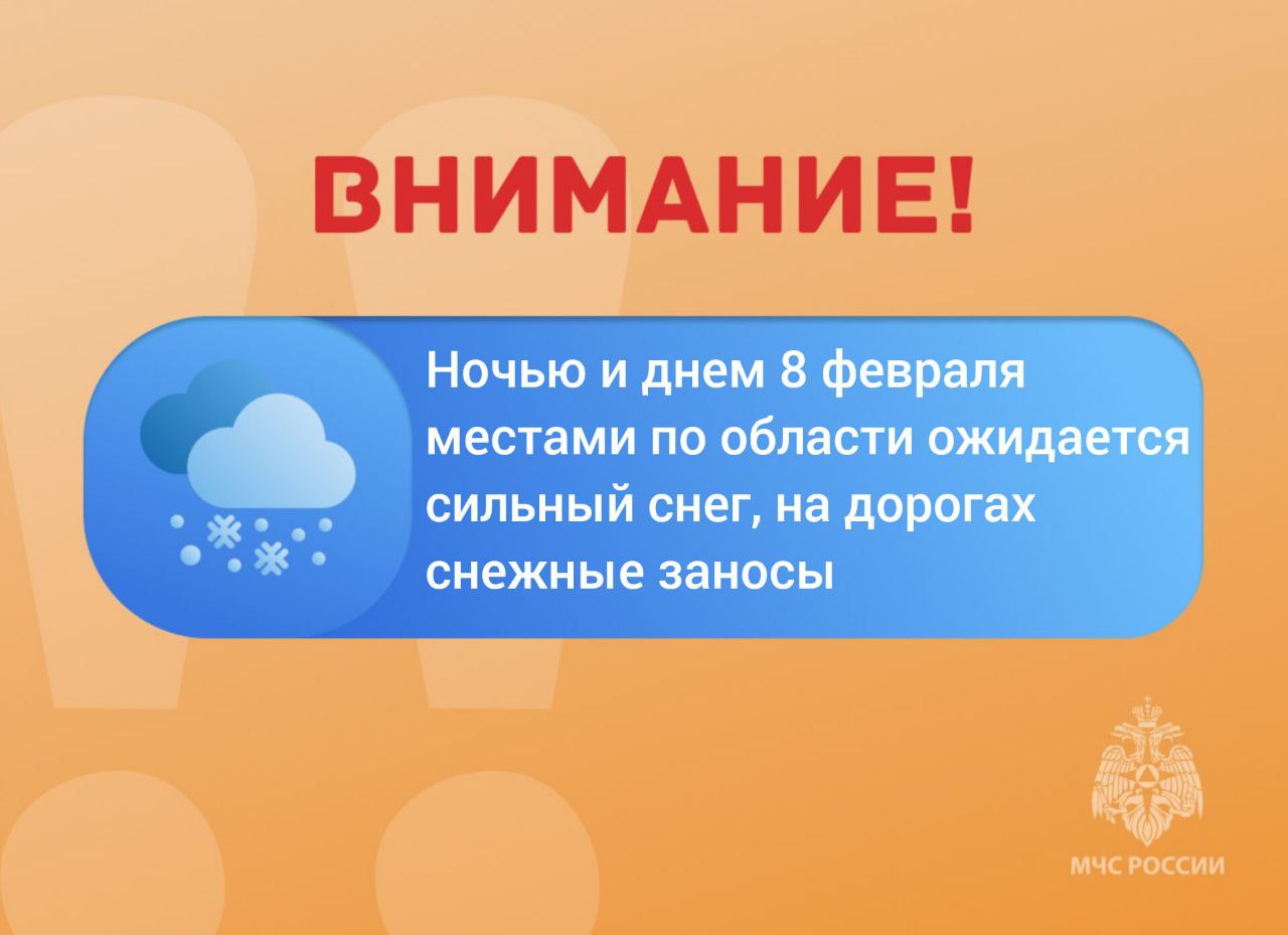 ВНИМАНИЕ. Ожидается «желтый» уровень опасности: ночью и днем 8 февраля местами по области ожидается сильный снег, на дорогах снежные заносы
