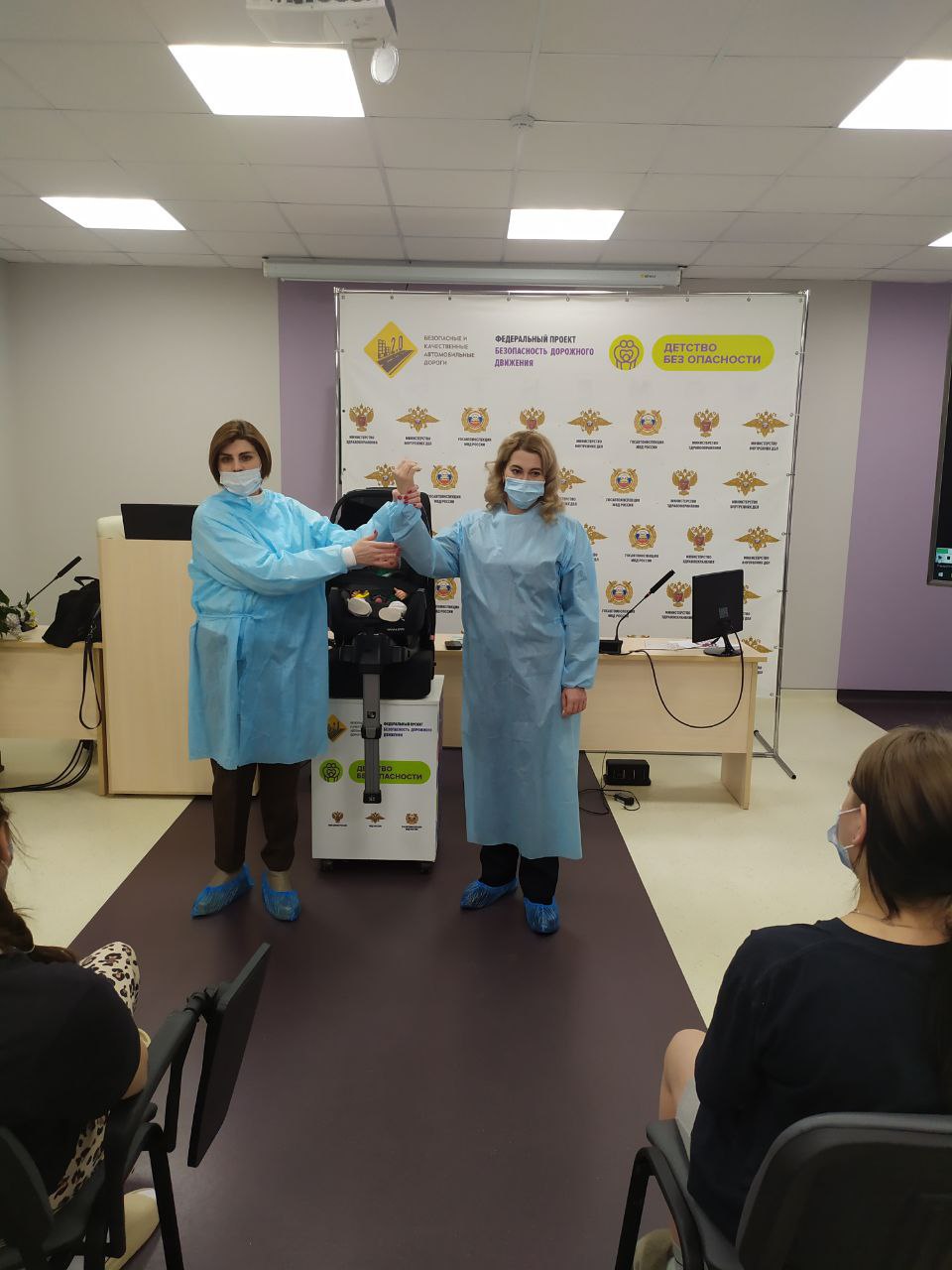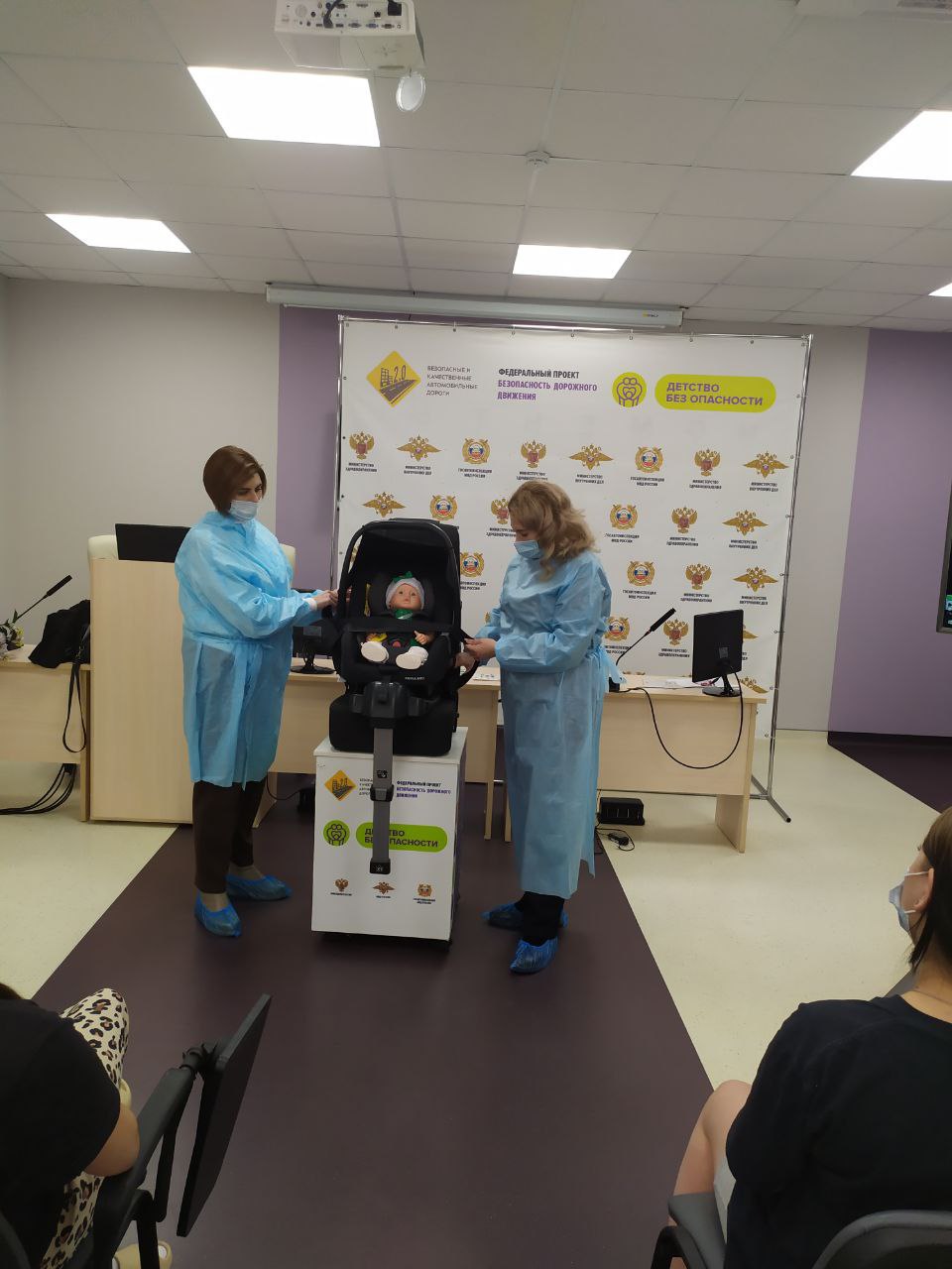 На тренингах в перинатальном центре «Мама» сотрудники Госавтоинспекции совместно со специалистами Дирекции безопасности дорожного движения и прошедшие специальную подготовку медицинские работники рассказывают о важности использования детских удерживающих устройств, объясняют, почему младенцы являются самой незащищенной категорией участников дорожного движения и подлежат обязательной перевозке с использованием детских удерживающих устройств уже с самой первой поездки малыша в автомобиле. Во время тренингов будущие родители применяют полученные знания на практике и тренируются правильно фиксировать ребенка в автолюльке, пристегивая его ремнями безопасности.
