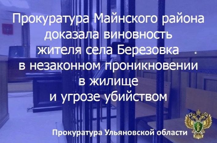 Майнский районный суд Ульяновской области вынес приговор по уголовному делу в отношении жителя региона. Он признан виновным по ч. 1 ст. 139 УК РФ (незаконное проникновение в жилище, совершенное против воли проживающего в нем лица), ч. 1 ст. 119 УК РФ (угроза убийством, если имелись основания опасаться осуществления этой угрозы).