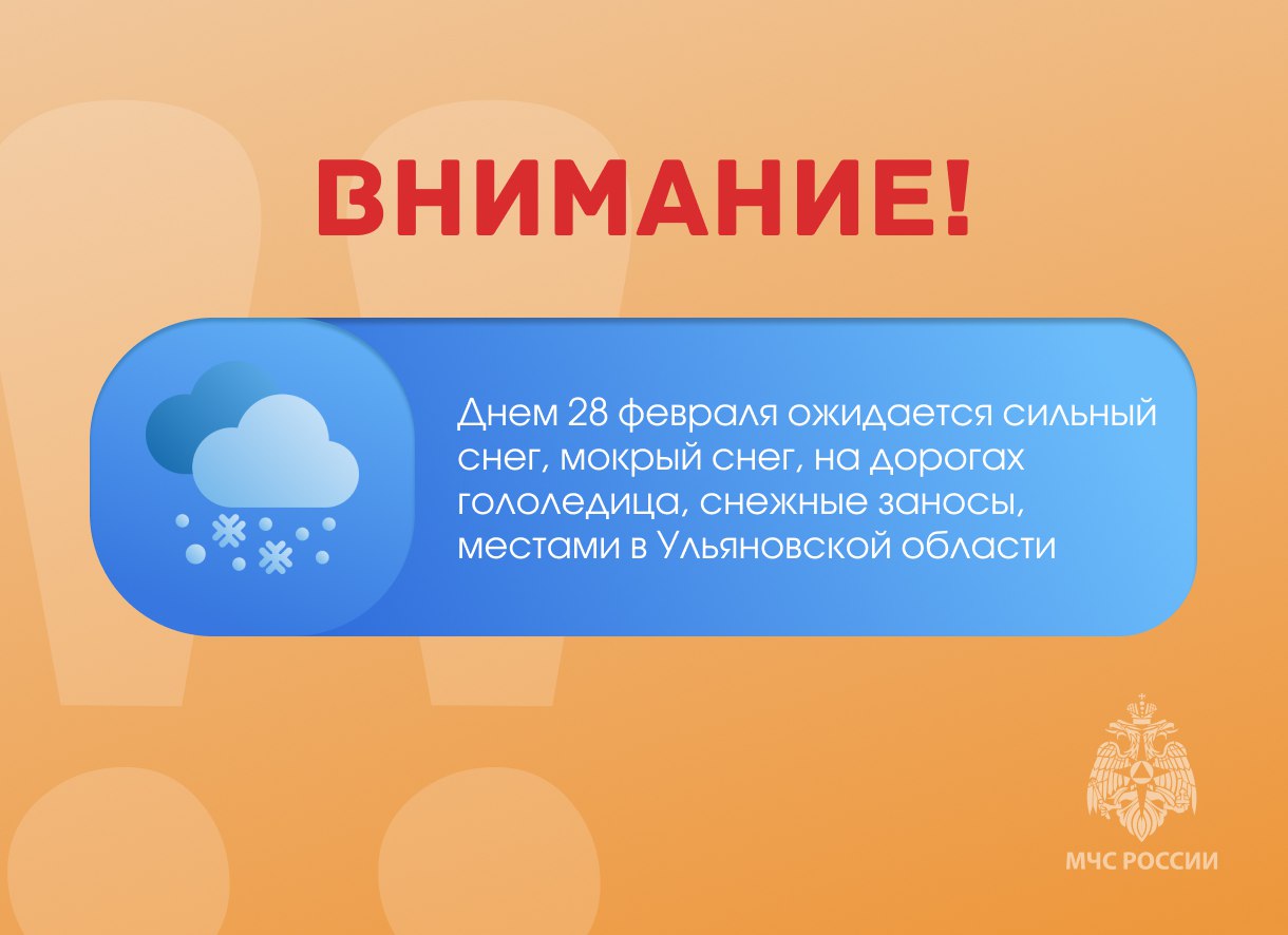 Днем 28 февраля ожидается сильный снег, мокрый снег, на дорогах гололедица, снежные заносы, местами в Ульяновской области.