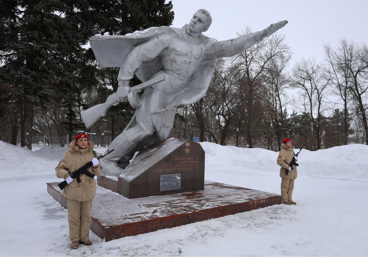 В рамках торжественного открытия исторической реконструкции присутствующие возложили цветы к памятнику Александра Матросова и почтили память героев – участников Великой Отечественной войны минутой молчания.