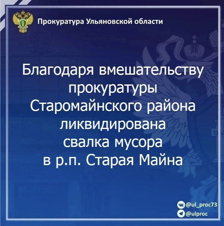 Подобное бездействие влекло ущемление интересов граждан и угрозу причинения вреда экологии, что послужило основанием для внесения представления об устранении нарушений закона и возбуждения в отношении начальника Управления жилищно-коммунального хозяйства, топливно-энергетических ресурсов и экологической безопасности администрации муниципального образования «Старомайнский район» дела об административном правонарушении по ч. 1 ст. 6.3 КоАП РФ (нарушение законодательства в области обеспечения санитарно-эпидемиологического благополучия населения, выразившееся в нарушении действующих санитарных правил и гигиенических нормативов, невыполнении санитарно-гигиенических и противоэпидемических мероприятий).