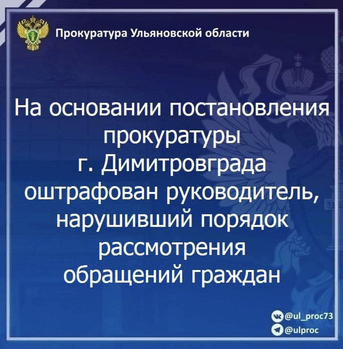 По результатам рассмотрения возбужденного прокурором г. Димитровграда Ульяновской области дела об административном правонарушении по ст. 5.59 КоАП РФ (нарушение порядка рассмотрения обращений граждан) и.о. председателя Комитета по жилищно-коммунальному комплексу Администрации города Димитровграда подвергнута штрафу в размере 5 тысяч рублей.