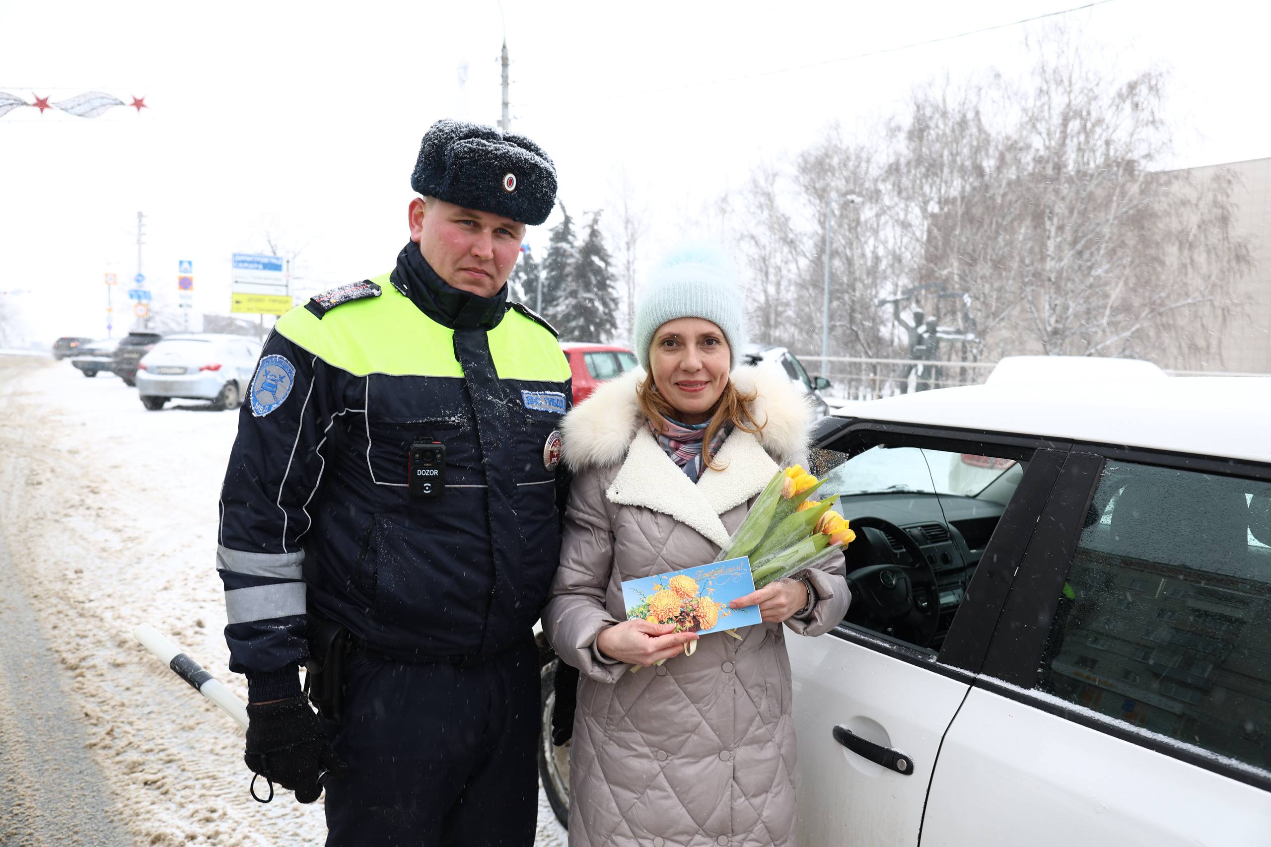 Традиционно в преддверии 8 Марта сотрудники Госавтоинспекции Ульяновской области поздравляют автоледи с весенним праздником — Международным женским днем. Во время поздравительной акции инспекторы ДПС останавливали автомобили под управлением прекрасной половины человечества, которых ждал приятный сюрприз. Сотрудники Госавтоинспекции и представители общественности подарили девушкам - водителям цветы и открытки, которые подготовили дети.