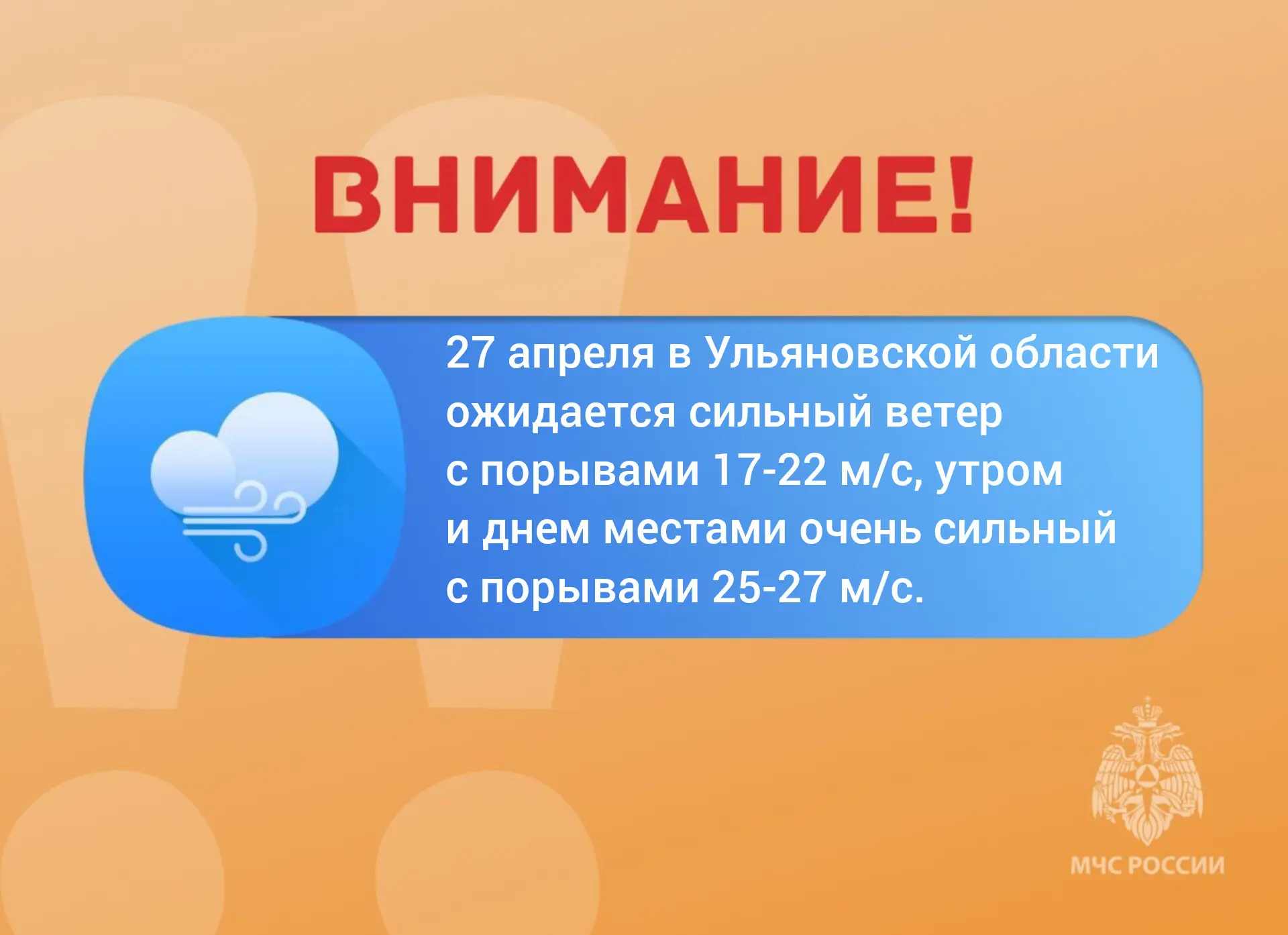Ожидается "оранжевый" уровень опасности: 27 апреля в Ульяновской области ожидается сильный ветер с порывами 17-22 м/с, утром и днем местами очень сильный с порывами 25-27 м/с.