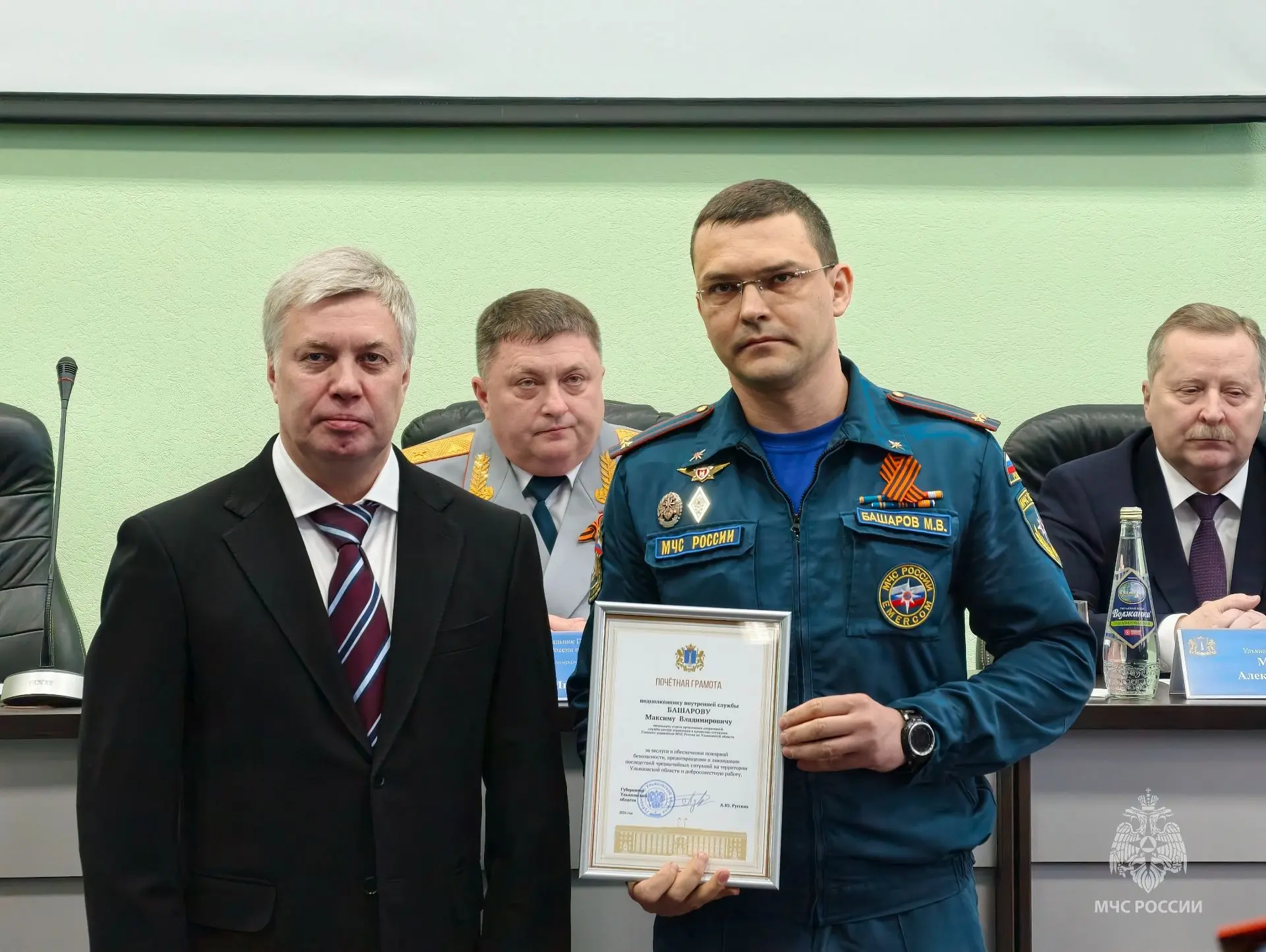 За заслуги в обеспечении пожарной безопасности в Ульяновской области, достигнутые успехи в тушении пожаров и проведении аварийно-спасательных работ, высокий профессионализм и добросовестную службу Алексей Русских вручил сотрудникам федеральной и областной противопожарной службы Почётные грамоты и Благодарственные письма.