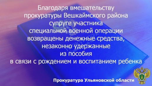 Установлено, что в результате ошибки должностного лица регионального Отделения Социального фонда РФ неправомерно были удержаны денежные средства в размере более 15 тысяч рублей, выплаченные супруге участника специальной военной операции в качестве...