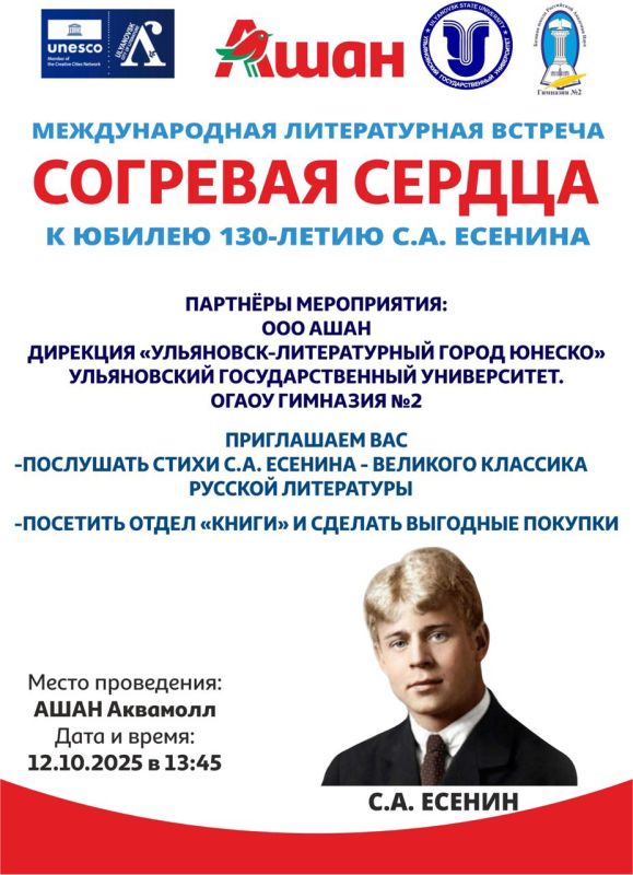 12 октября в 13:45 в ТРЦ «Аквамолл» состоится международная литературная встреча «Согревая сердца. К 130-летию С. А. Есенина». Вас ждёт путешествие в мир поэзии Серебряного века!Горожане и гости города смогут послушать стихи Сергея Есенина —...