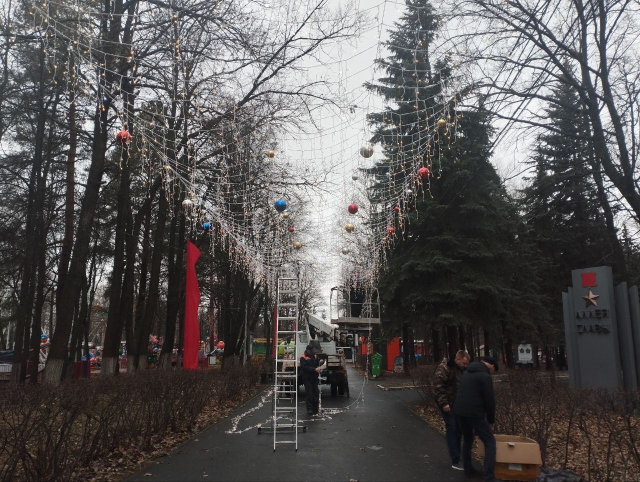 Сегодня в парке Победы специалисты монтируют световой потолок и ёлочные шары