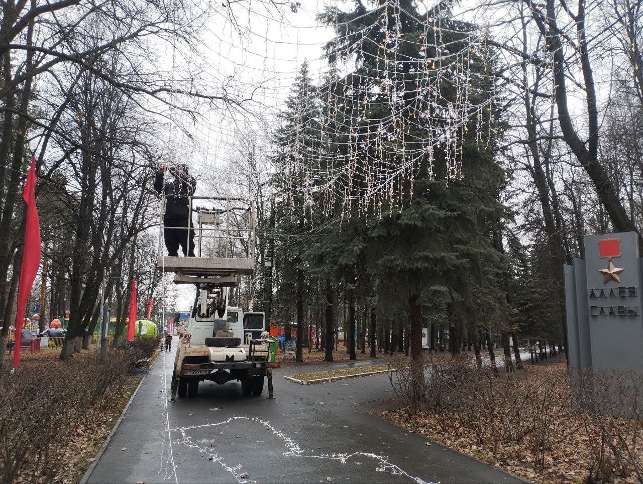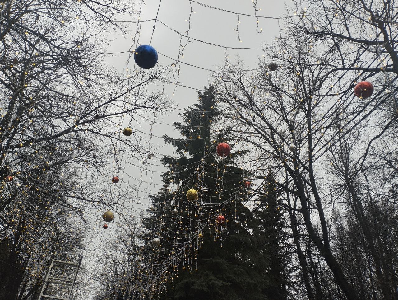 Сегодня в парке Победы специалисты монтируют световой потолок и ёлочные шары.