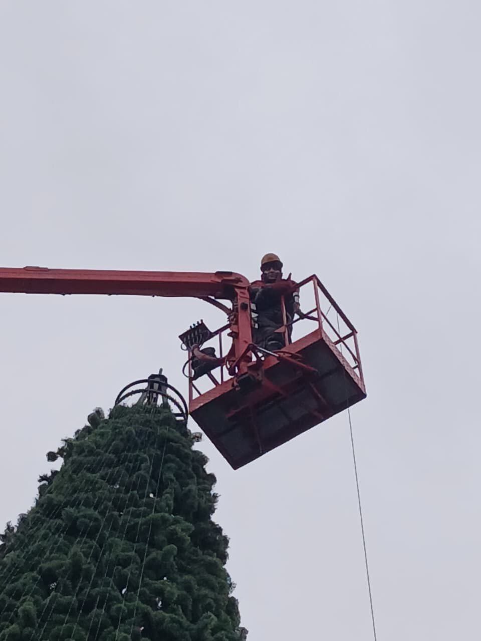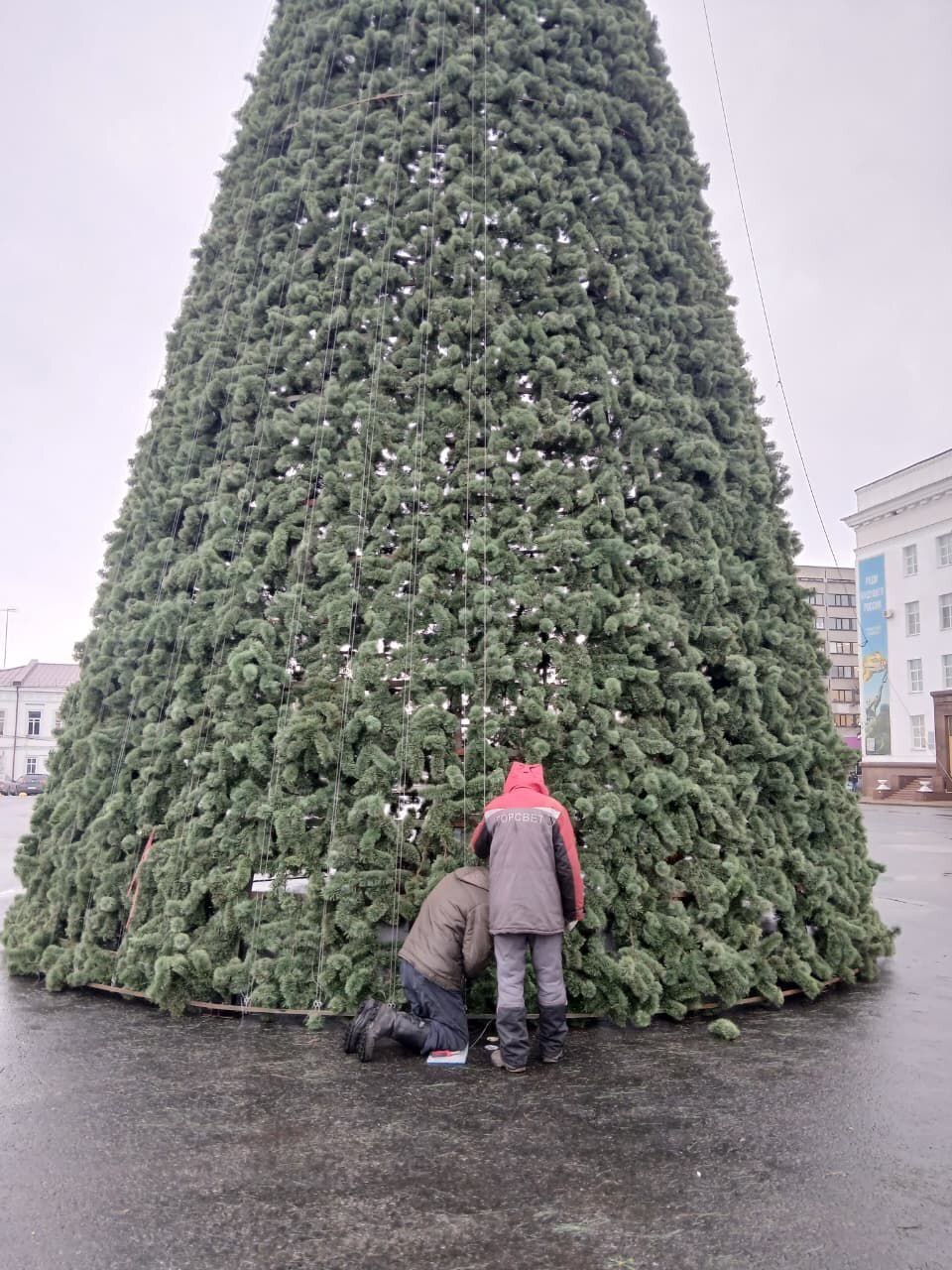 На главную городскую ёлку монтируют световые нити и гирлянды.