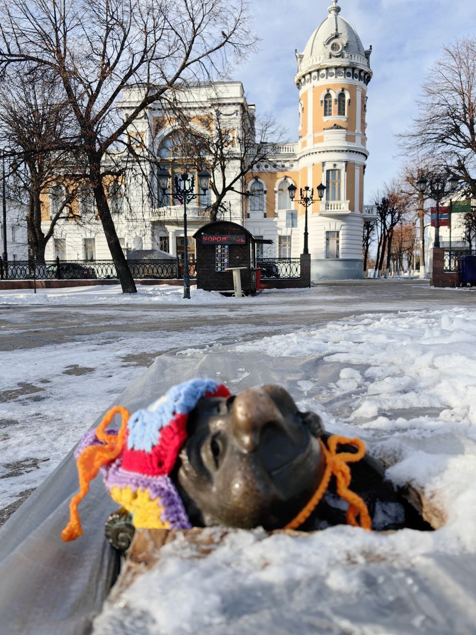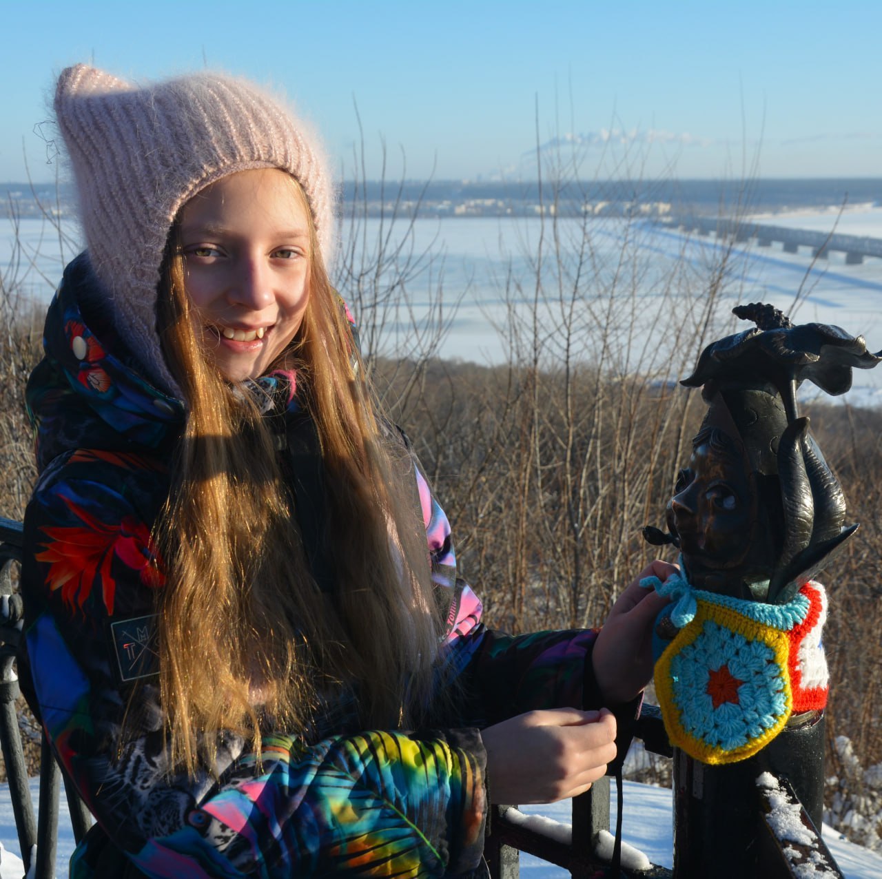 Мама Светлана с дочками Аглаей, Авророй и Мирославой — воспитанницами Академии одарённых детей — связали тёплые шарфы, пелерины и шапочки ярких цветов.
