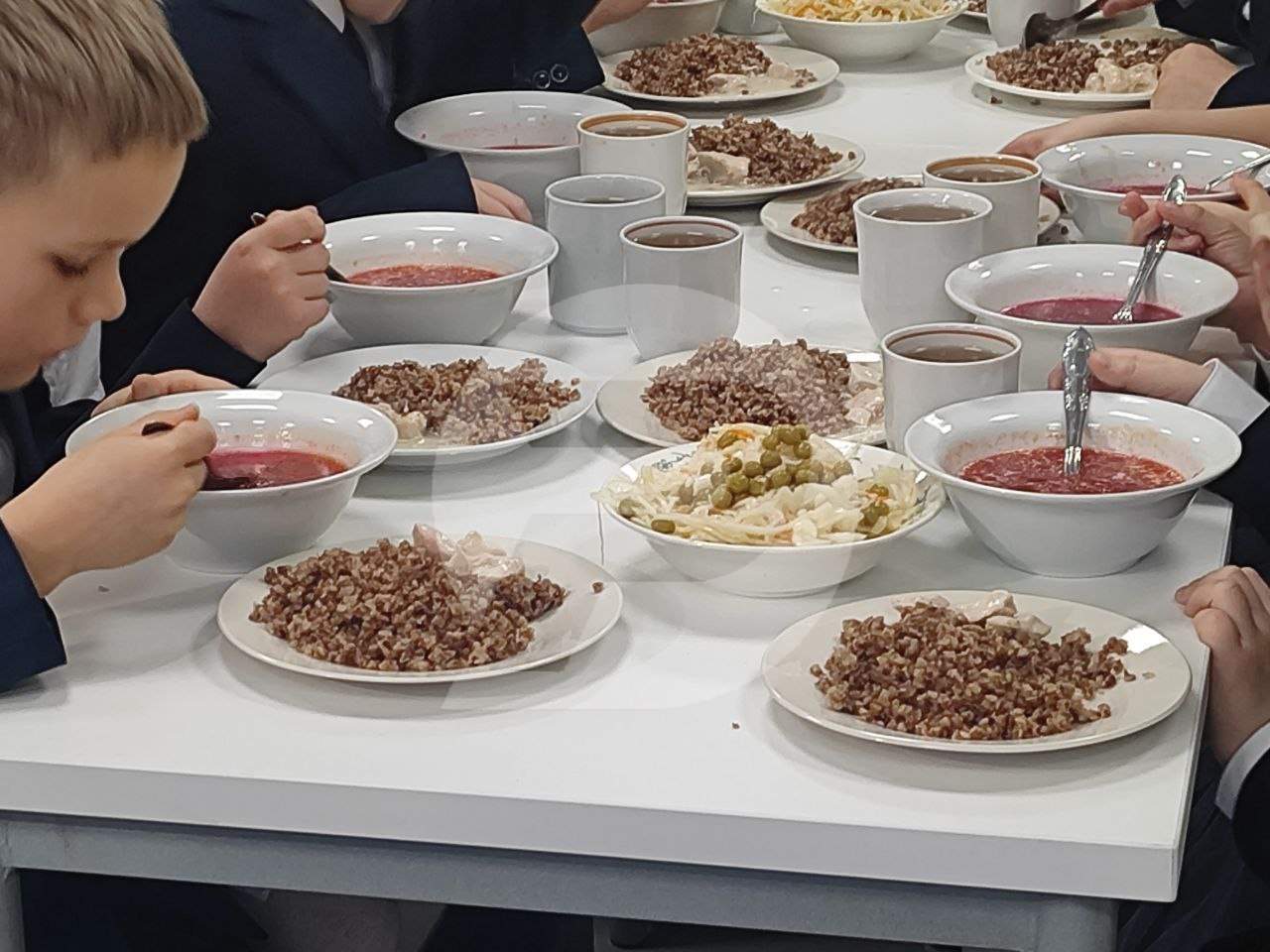 100% младшеклассников имеют возможность питаться в школе бесплатно. Пример — школа в Засвияжском районе Ульяновска. Меню вкусное и разнообразное. Борщ, гречка с аппетитным дополнением, салат с зеленым горошком. Еда разнообразная, с учетом потребностей растущего организма.