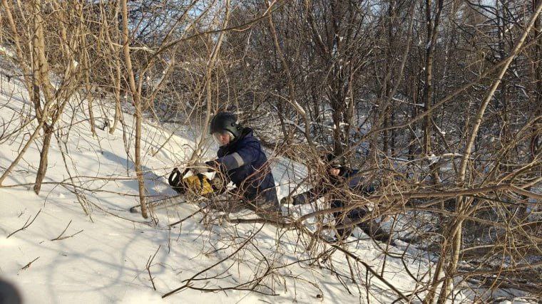 Городские спасатели работают, несмотря на морозы, сугробы и крутизну склона. 3 и 4 февраля они убрали ещё 22 сорных американских клёна и карагача, а также 100 квадратных метров поросли.