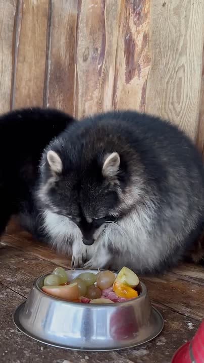 Посмотрите, какой красочный обед у енота из Ульяновского зоопарка.