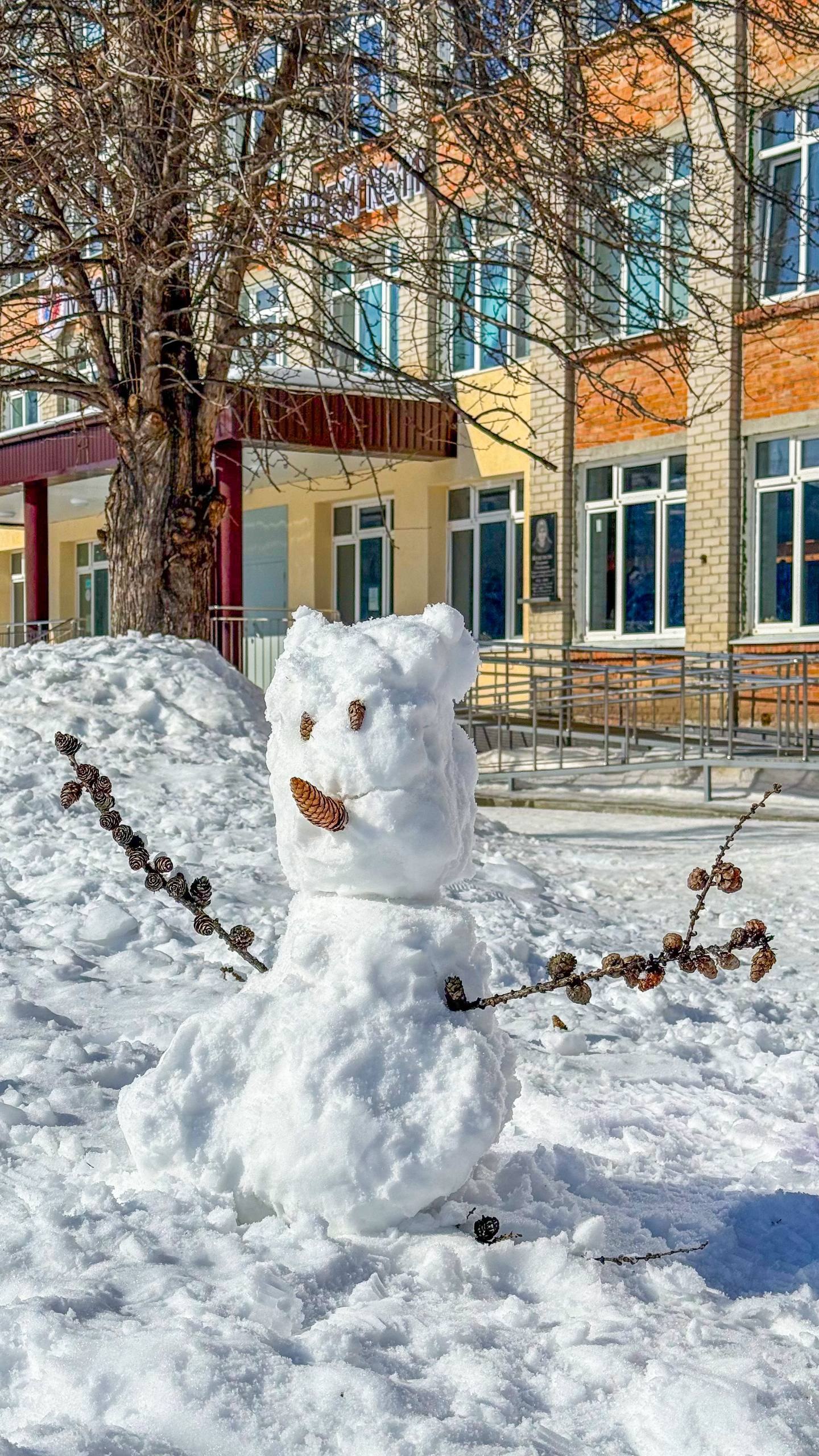 Снежная пауза. Снеговик радуется теплу возле Лицея №11