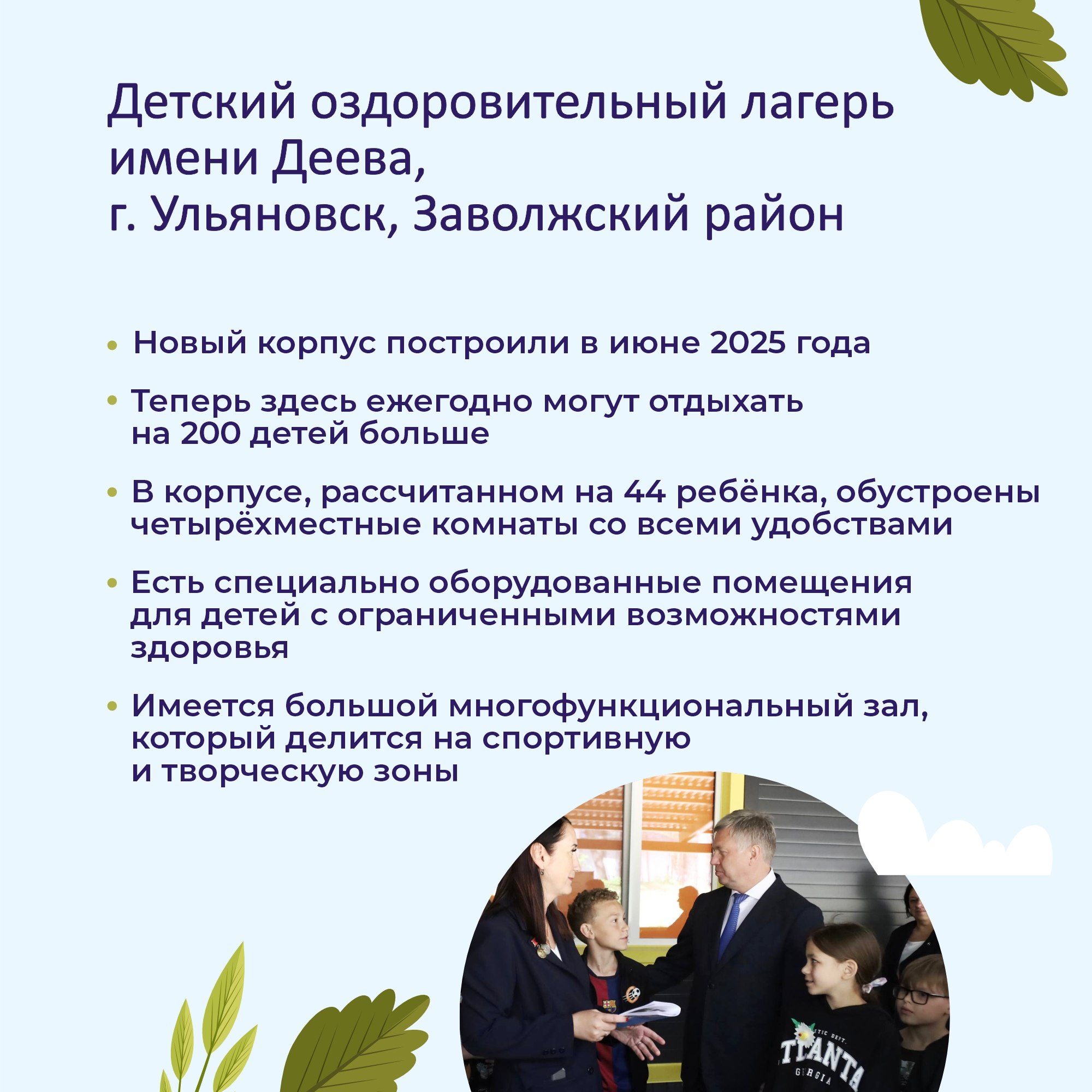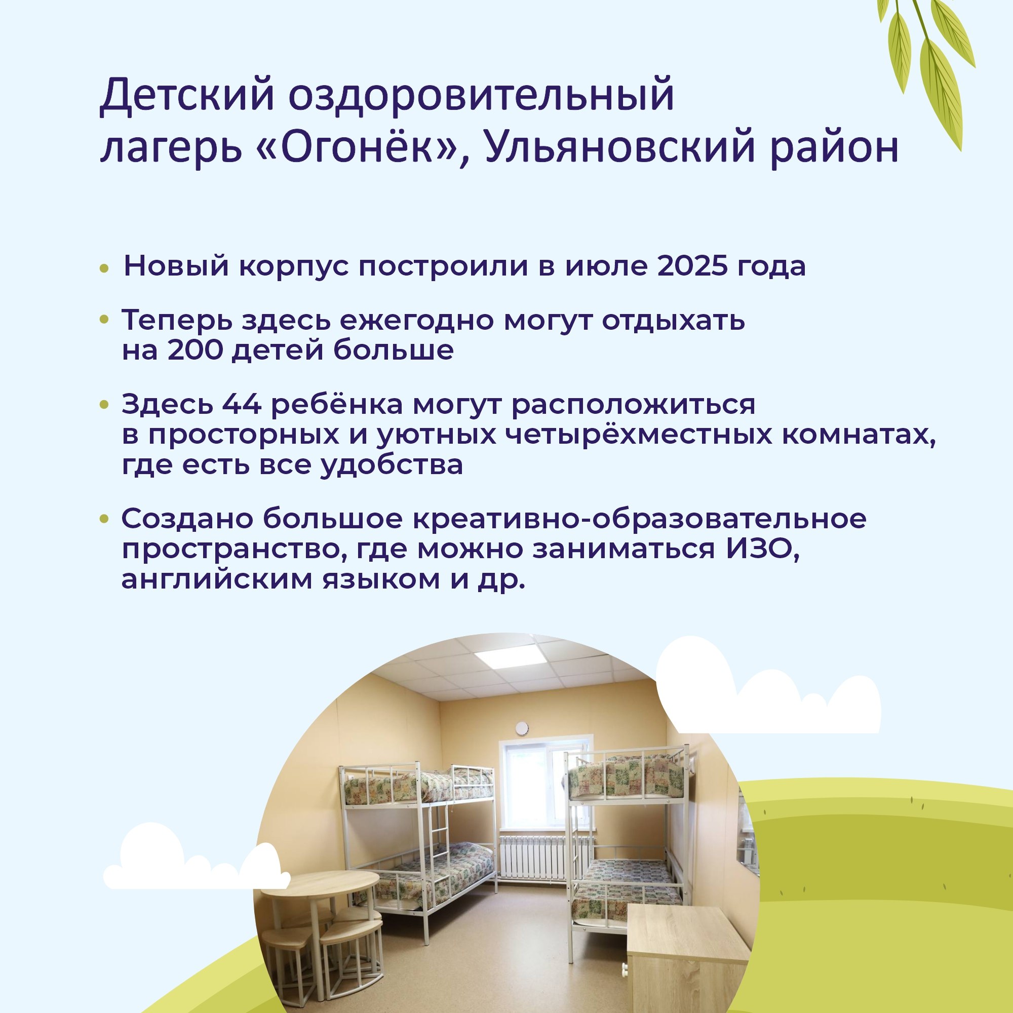 Чтобы отдых был комфортным, летние оздоровительные лагеря Ульяновской области модернизируются в рамках федерального проекта «Создание условий для обучения, отдыха и оздоровления детей и молодёжи». Губернатор Алексей Русских лично следит за развитием этого проекта, который успешно реализуется уже третий год. За последние два года возведены новые корпуса в трех загородных лагерях, а в остальных производится капитальный ремонт.