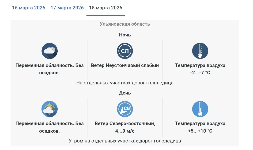 Сегодня, 16 марта, в Ульяновской области прогнозируется переменная облачность, без осадков. Ветер ожидается юго-восточный 3…8 метров в секунду. Температура +4…+9 градусов Цельсия. Утром на отдельных участках дорог возможна гололедица.// Ulpravda.ru. Новости Ульяновска