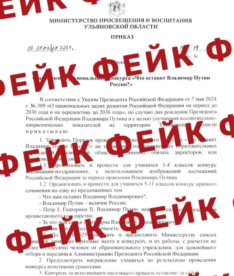 Центр управления регионом (ЦУР) сообщил, что в социальных сетях и мессенджерах анонимы начали делиться якобы официальным приказом Министерства просвещения и воспитания Ульяновской области. В нём, по их утверждению, школам и другим образовательным учреждениям якобы предписывалось провести патриотический конкурс накануне дня рождения главы государства.