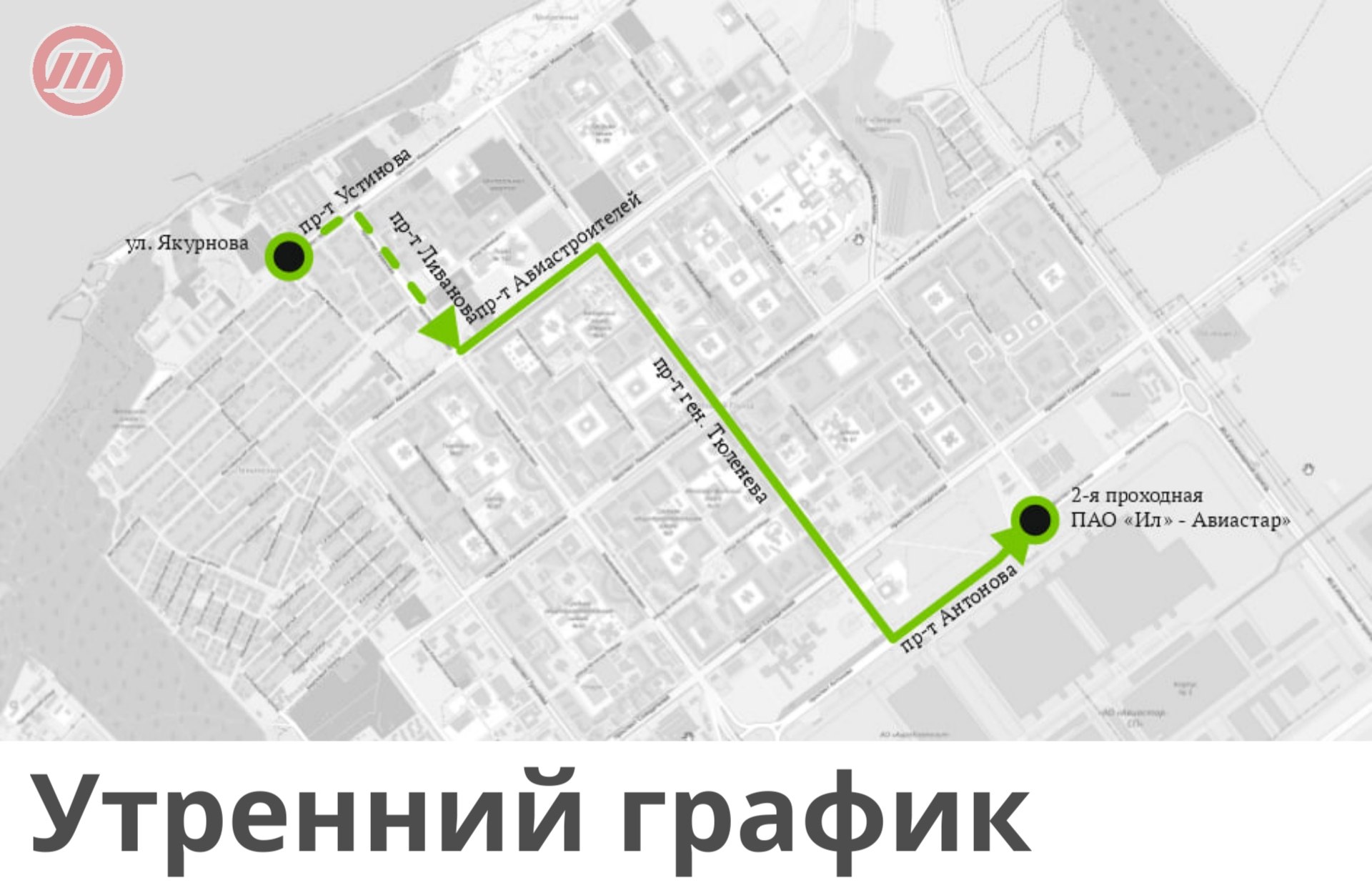 от 4-й проходной ПАО «Ил» (Авиастар) — по проезду А. Сысцова, проспектам Антонова, Генерала Тюленева, Созидателей, улицам Деева, Вр. Михайлова и Оренбургской — до санатория «Итиль».