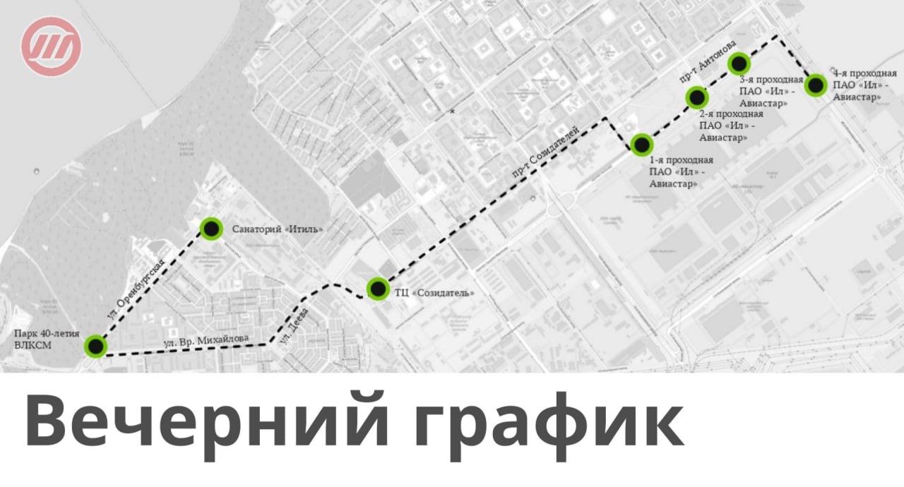 от 4-й проходной ПАО «Ил» (Авиастар) — по проезду А. Сысцова, проспектам Антонова, Генерала Тюленева, Созидателей, улицам Деева, Вр. Михайлова и Оренбургской — до санатория «Итиль».
