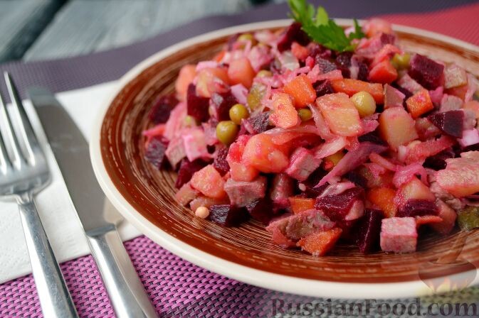 - Винегрет с мясом, яйцами и зелёным горошком: Этот вариант станет настоящей находкой для тех, кто хочет сделать салат более насыщенным. Состав включает отварное мясо, яйца и консервированный горошек, что сделает блюдо сытным и аппетитным.