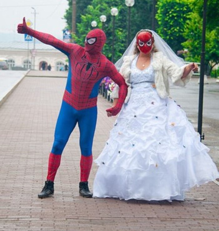 - Супергеройская тема: Один из ярких примеров оригинального подхода — костюм жениха в стиле Человека-паука, дополненный маской его романтической спутницы. Такой наряд подчеркивает любовь к комиксам и играм, а также создает атмосферу веселья.
