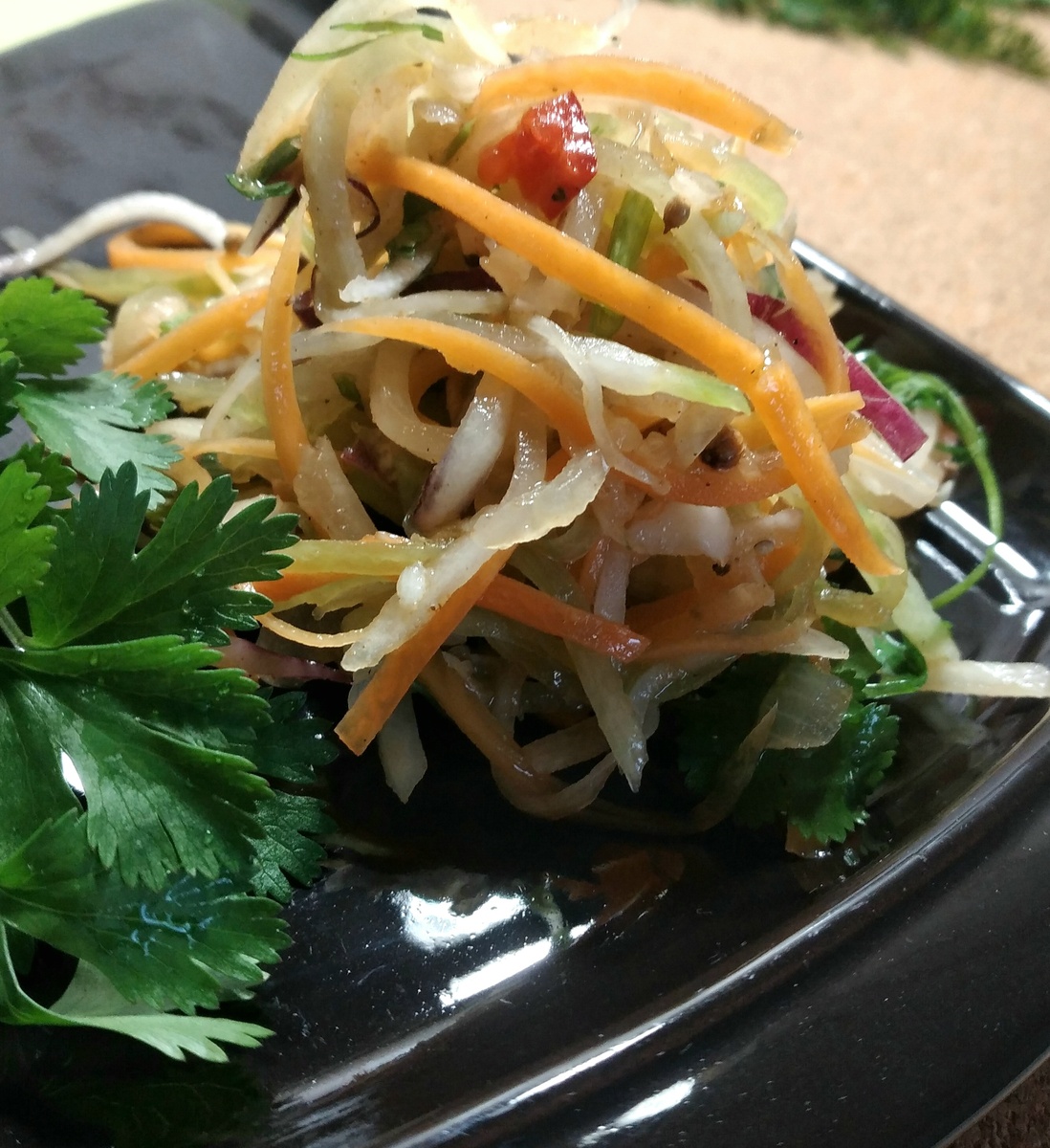 Чтобы создать этот уникальный салат, сначала нарезают дайкон и морковь соломкой. К ним добавляют одну столовую ложку соли — это поможет моркови стать мягче, а дайкону — выделить сок. Весь процесс занимает 30 минут, во время которых заготовка несколько раз перемешивается.