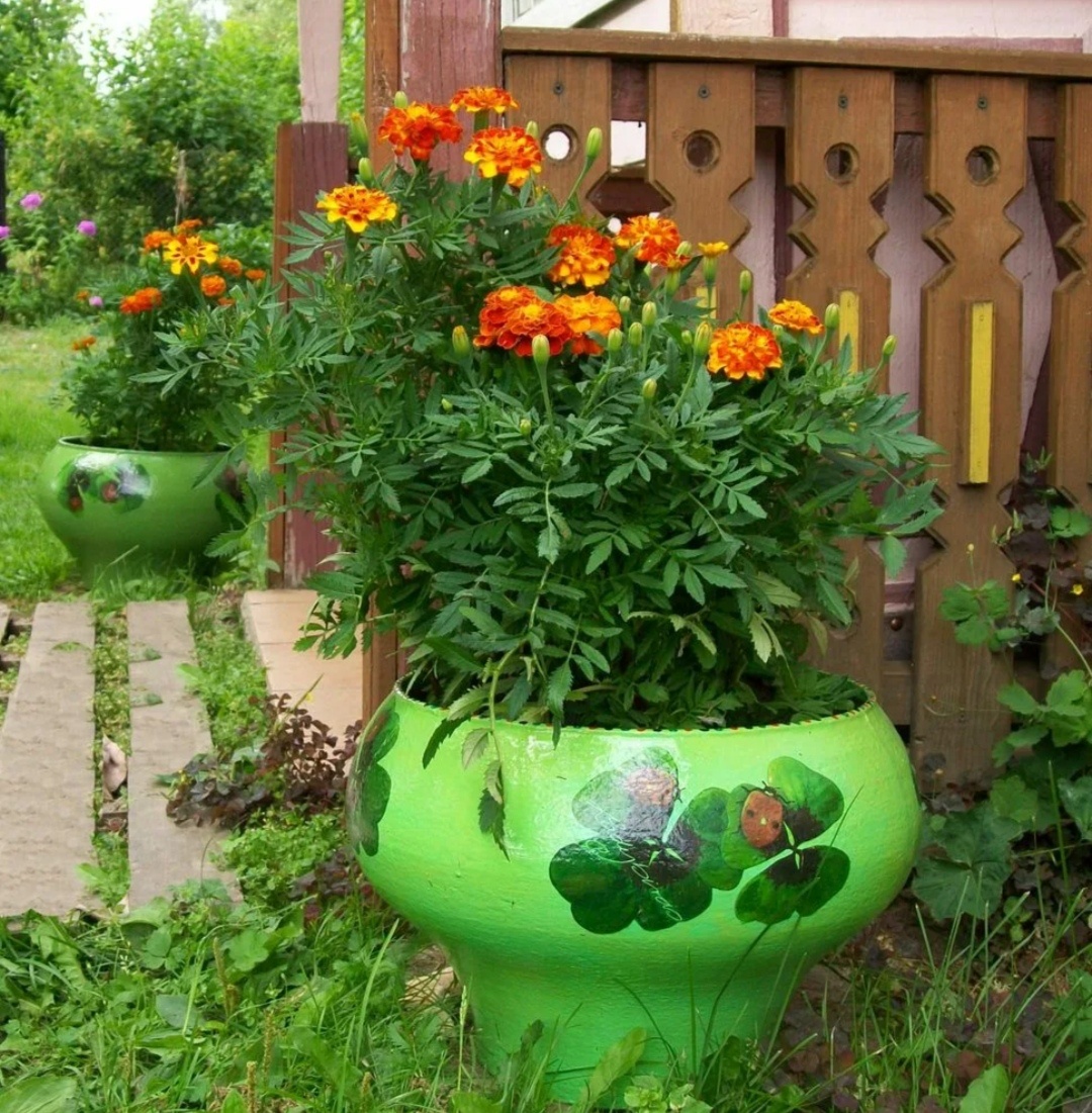 - Металлические кастрюли: Подойдут для создания стильных садовых кашпо. Краска и множество декоров сделают их изюминкой участка.