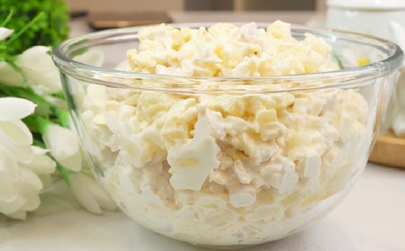 6. В большой миске объедините куриную грудку, яйца, сыр и ананасы. Заправьте салат майонезом и аккуратно перемешайте.
