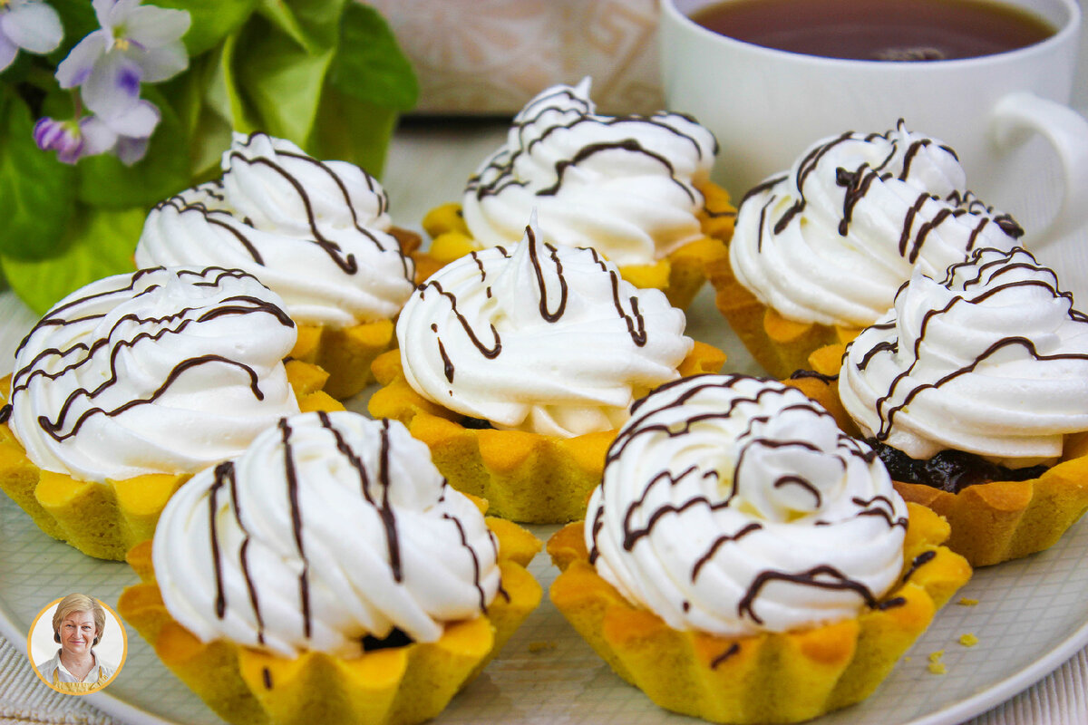 На дно каждой корзинки укладывается чайная ложка повидла, а сверху аккуратно выдавливается белковый крем с помощью кондитерского мешка. Если хотите, можно украсить растопленным шоколадом.
