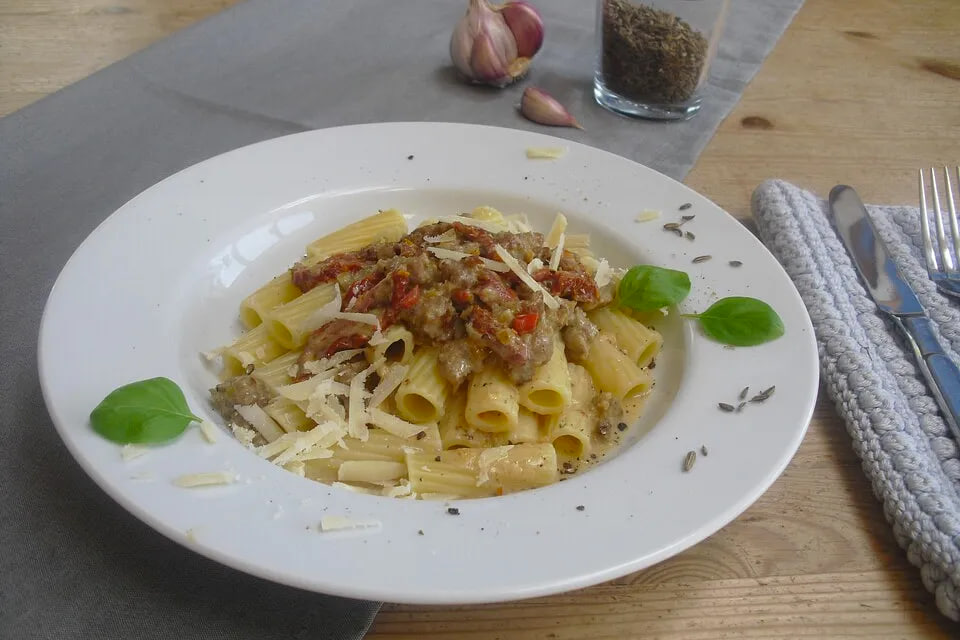 Как только фарш подрумянится, в сковороду добавляются нарезанные соломкой вяленые томаты и мелко порубленный перец чили. Даем этому всему потушиться пару минут, после чего вливаем сливки, доводим до легкого кипения и приправляем по вкусу. Не забудьте про мускатный орех — он добавит блюду изысканный аромат.