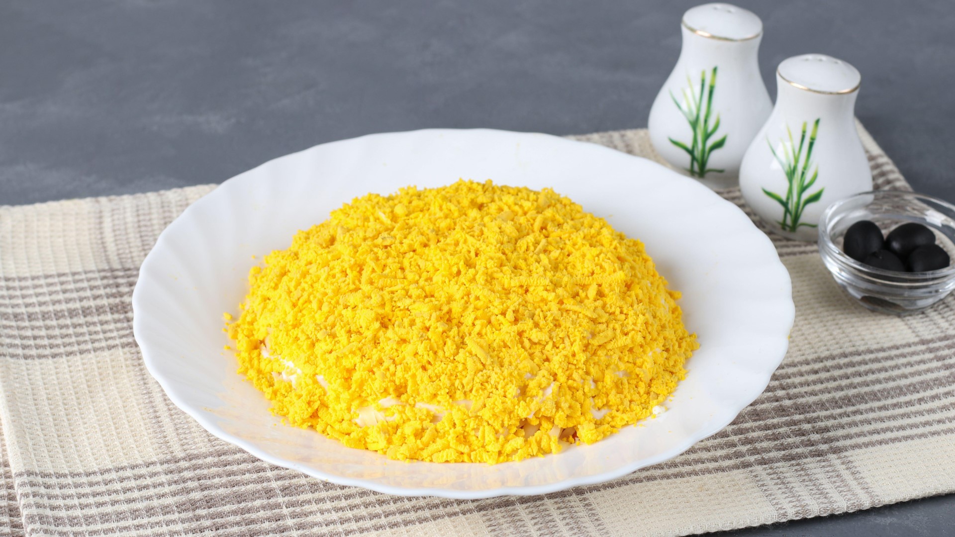 На верхушку салата натрите подмерзшее масло, высыпьте оставшийся сыр, снова смажьте майонезом и посыпьте измельченными желтком и белком, делится портал «Со Вкусом».