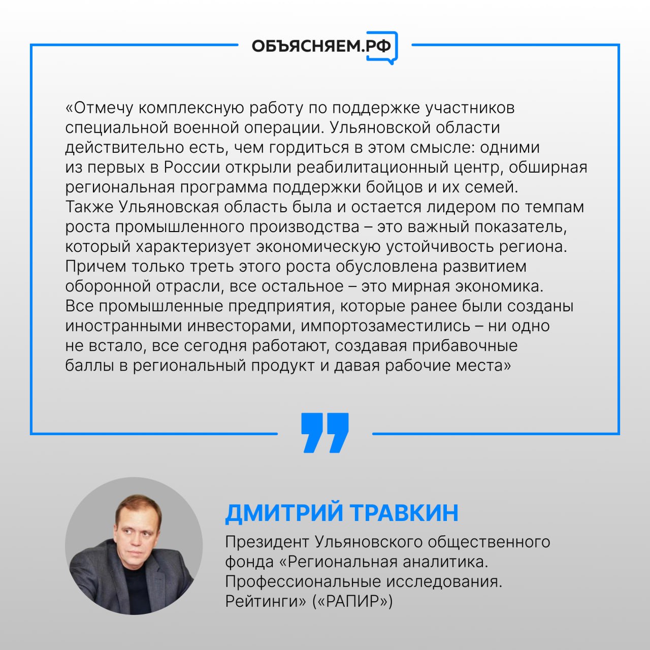 Президент ульяновского фонда «РАПИР» Дмитрий Травкин позитивно оценивает достижения Ульяновской области, особо выделяет работу главы региона Алексея Русских в сфере импортозамещения.
