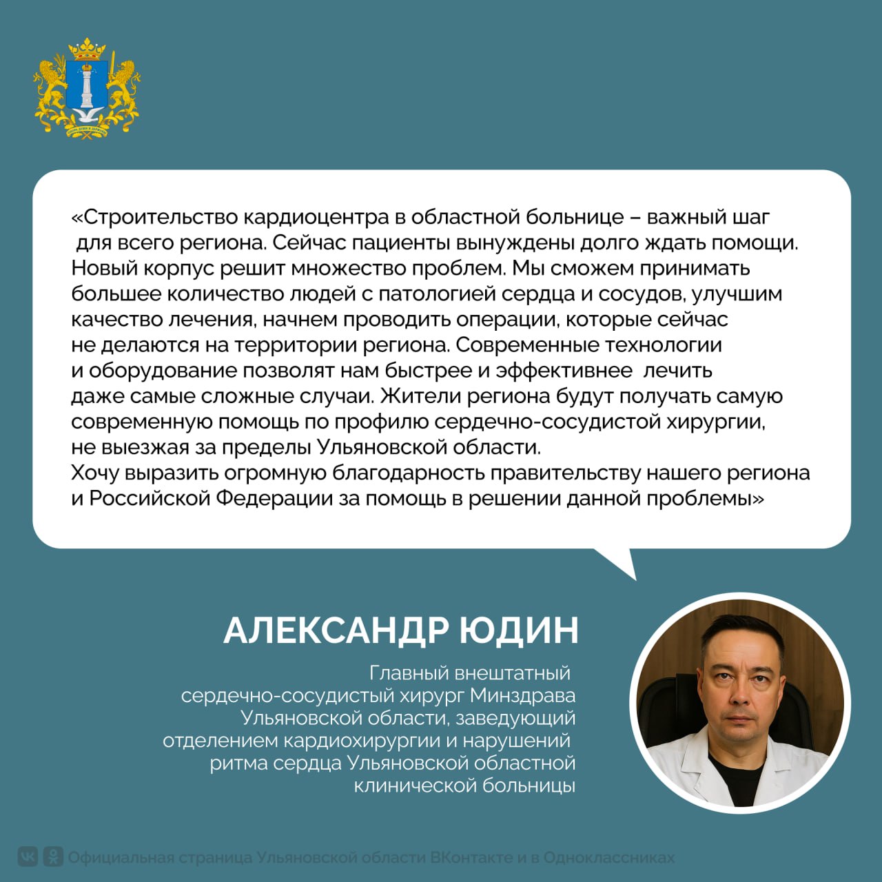 Владимир Путин идею поддержал и пообещал всестороннюю поддержку. Инициативу губернатора положительно оценили профильные медицинские специалисты. Завотделением кардиохирургии областной больницы Александр Юдин считает, что новый центр позволит проводить в Ульяновске такие операции, которые сейчас не делают. Пациентов вынуждено направляют в другие регионы, теряя драгоценное время.
