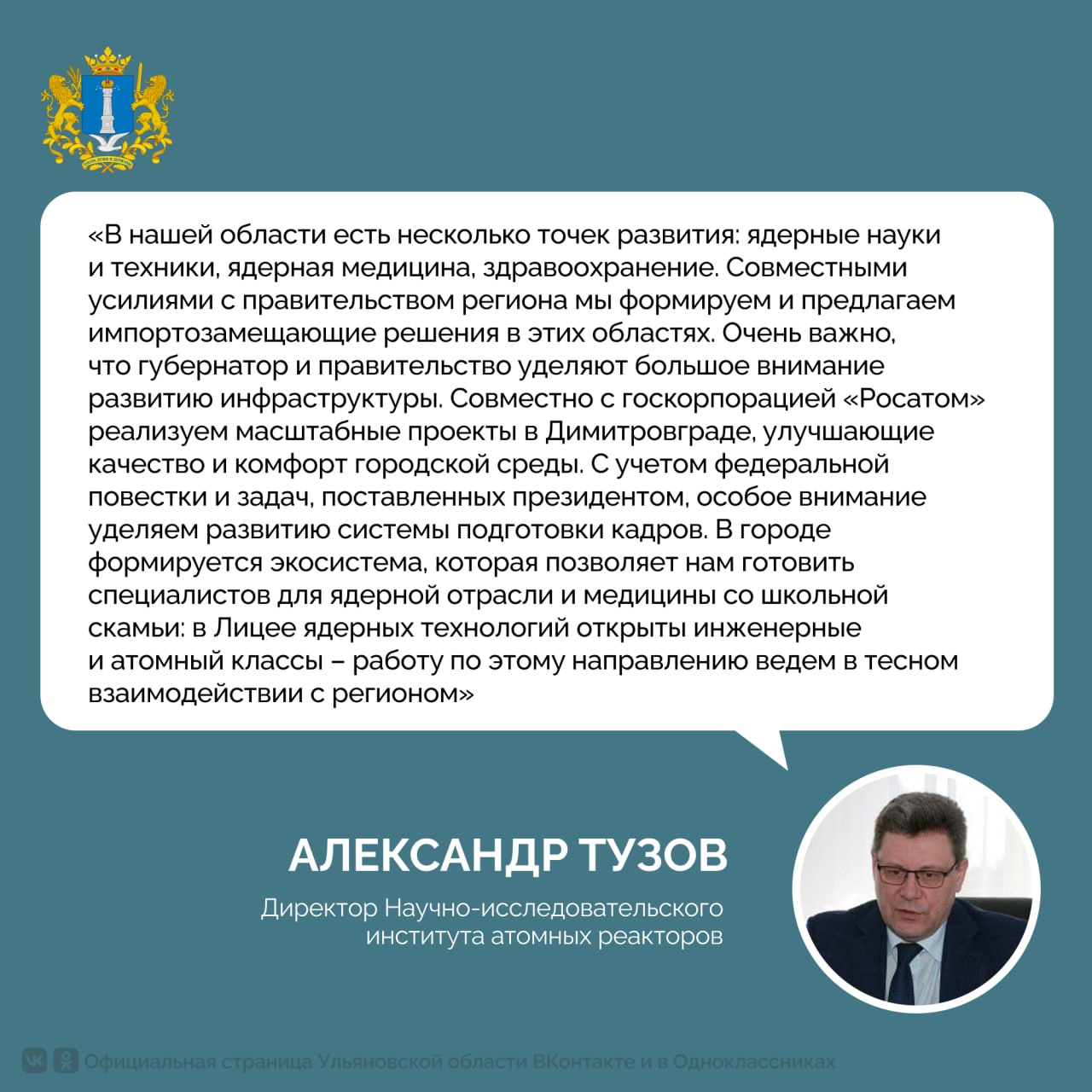 Как рассказал директор Научно-исследовательского института атомных реакторов Александр Тузов, в Димитровграде специалистов для ядерной отрасли и медицины начинают готовить уже со школы — такого результата удалось добиться благодаря тесному взаимодействию с губернатором и правительством Ульяновской области.