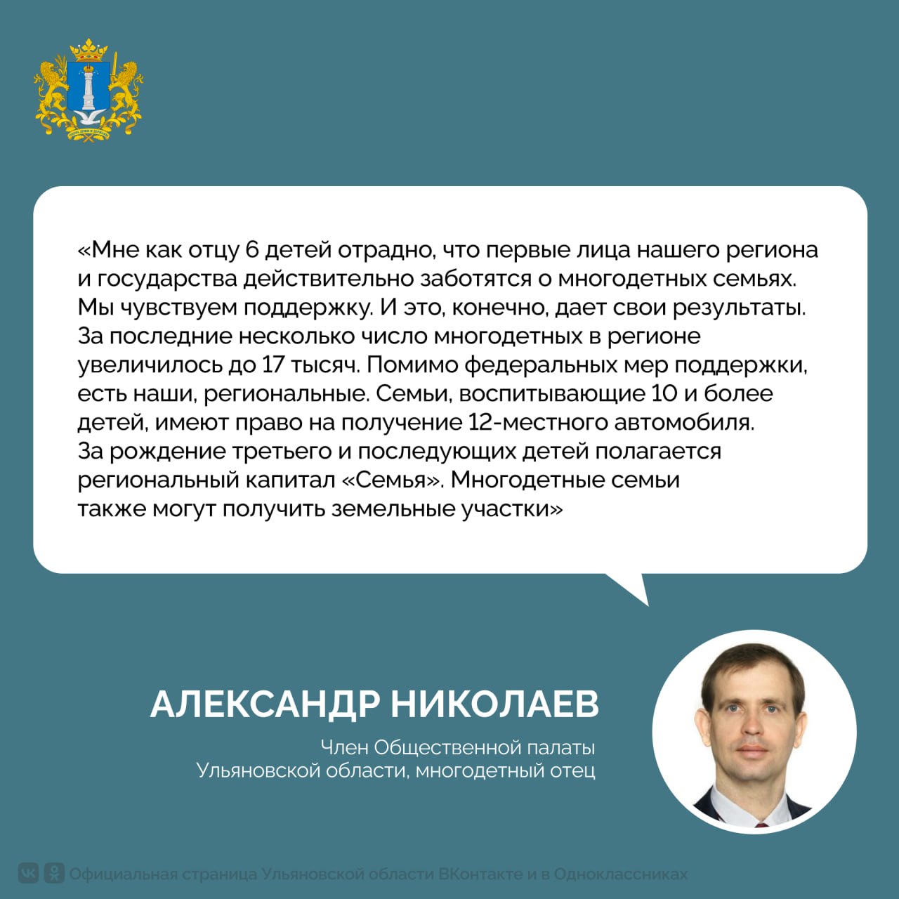 Об этом губернатор Ульяновской области Алексей Русских рассказал президенту РФ Владимиру Путину. В регионе растет количество многодетных семей: за последние пять лет на 4500 тысячи. Действует целый комплекс мер поддержки: льготы, выплаты, возможность получить земельный участок и автомобиль. Как отметил член Общественной палаты Ульяновской области Александр Николаев, такое внимание первых лиц государства и региона к многодетным семьям говорит о многом.